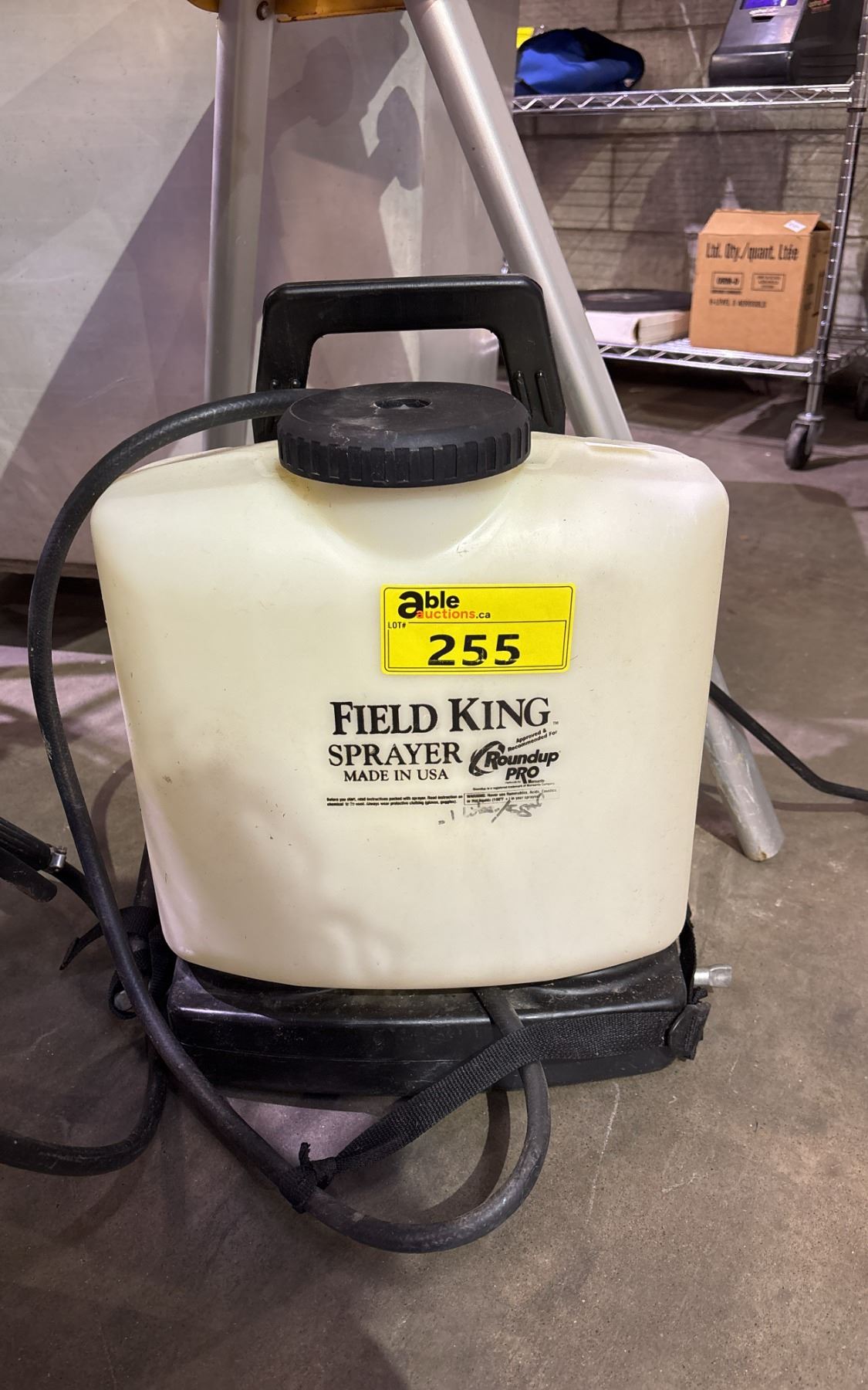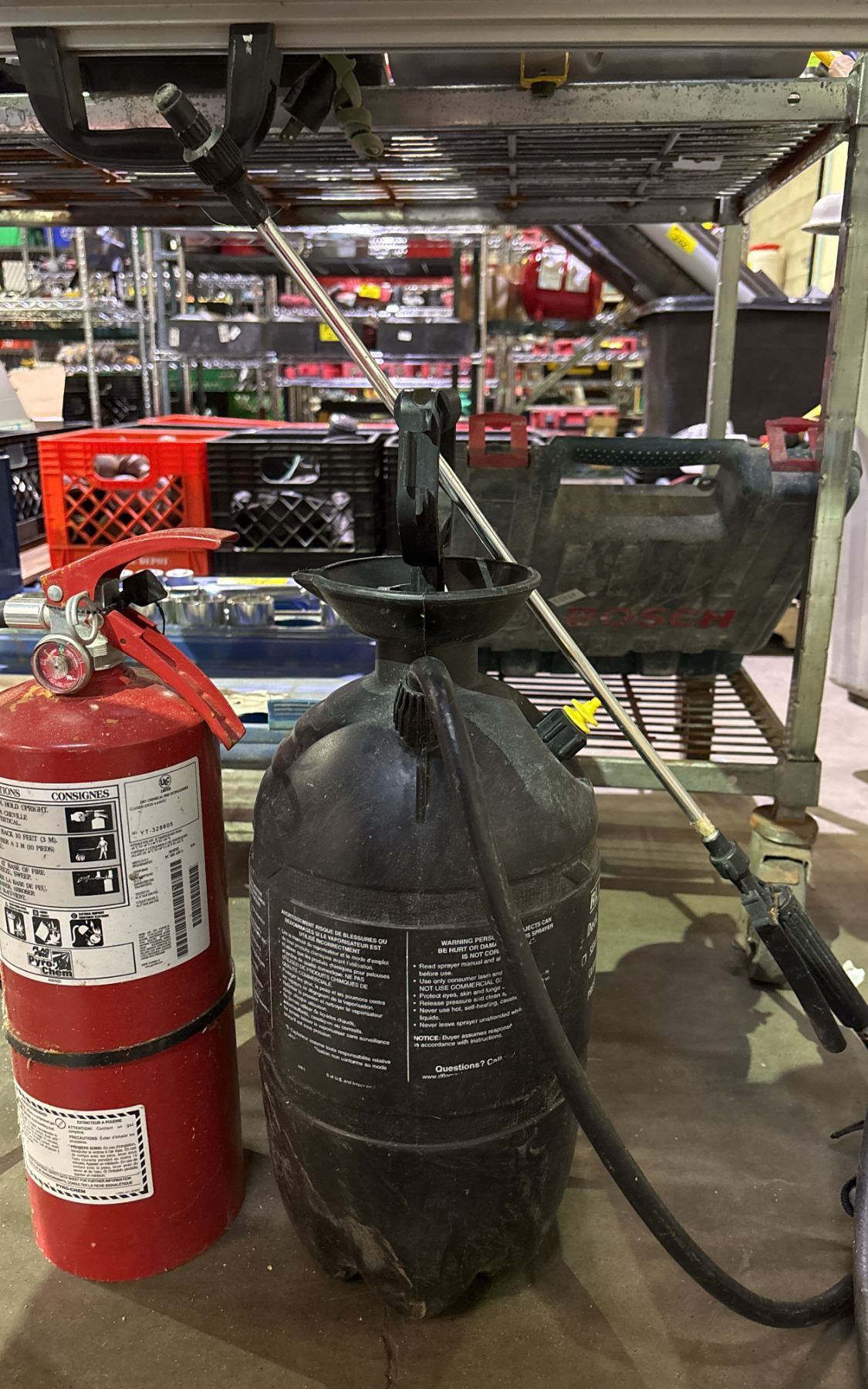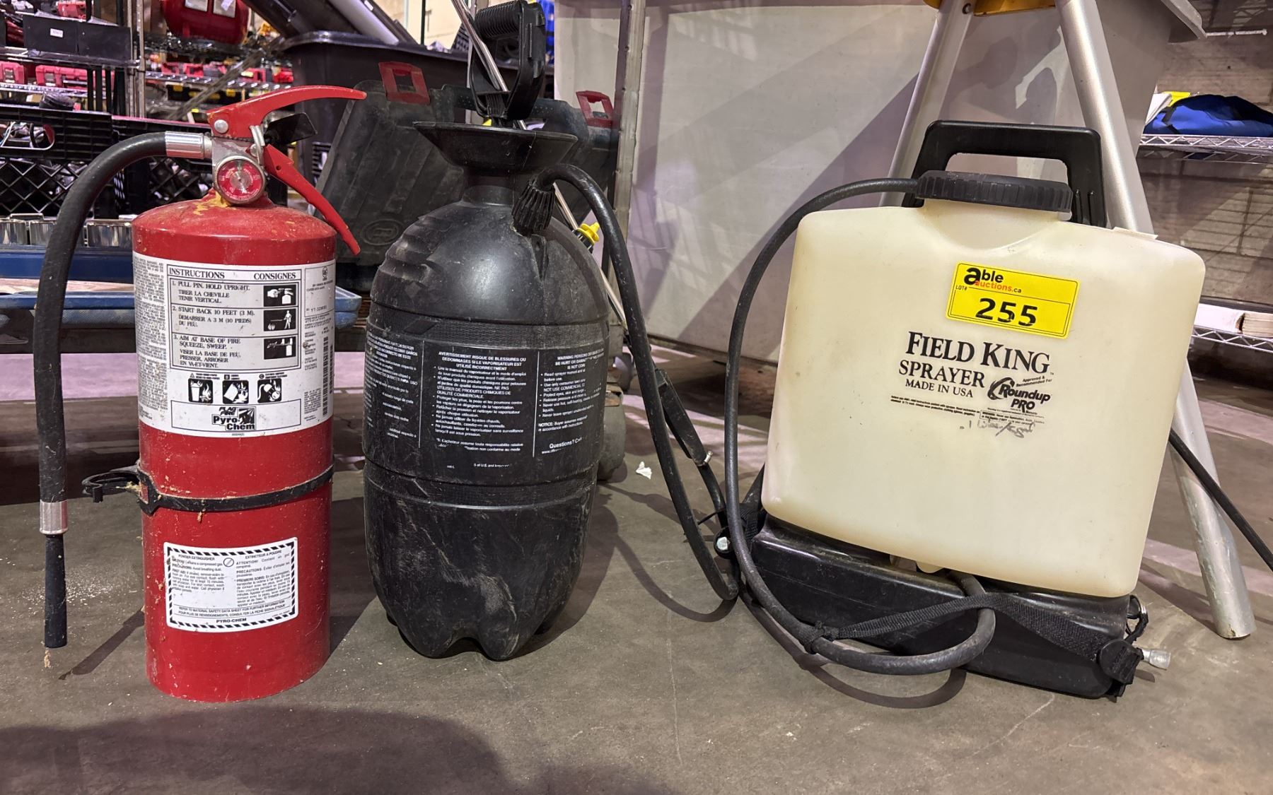 FIELD KING BACKPACK SPRAYER, FLO MASTER HAND PUMP SPRAYER & A FIRE EXTINGUISHER
