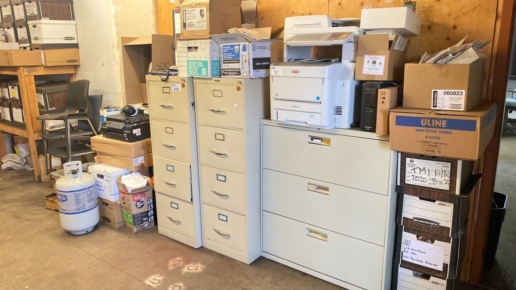 FILING CABINETS, DIGITAL SHIPPING SCALE, BATTERY BACKUP, OFFICE PRINTER, PROPANE BOTTLE, STACKING