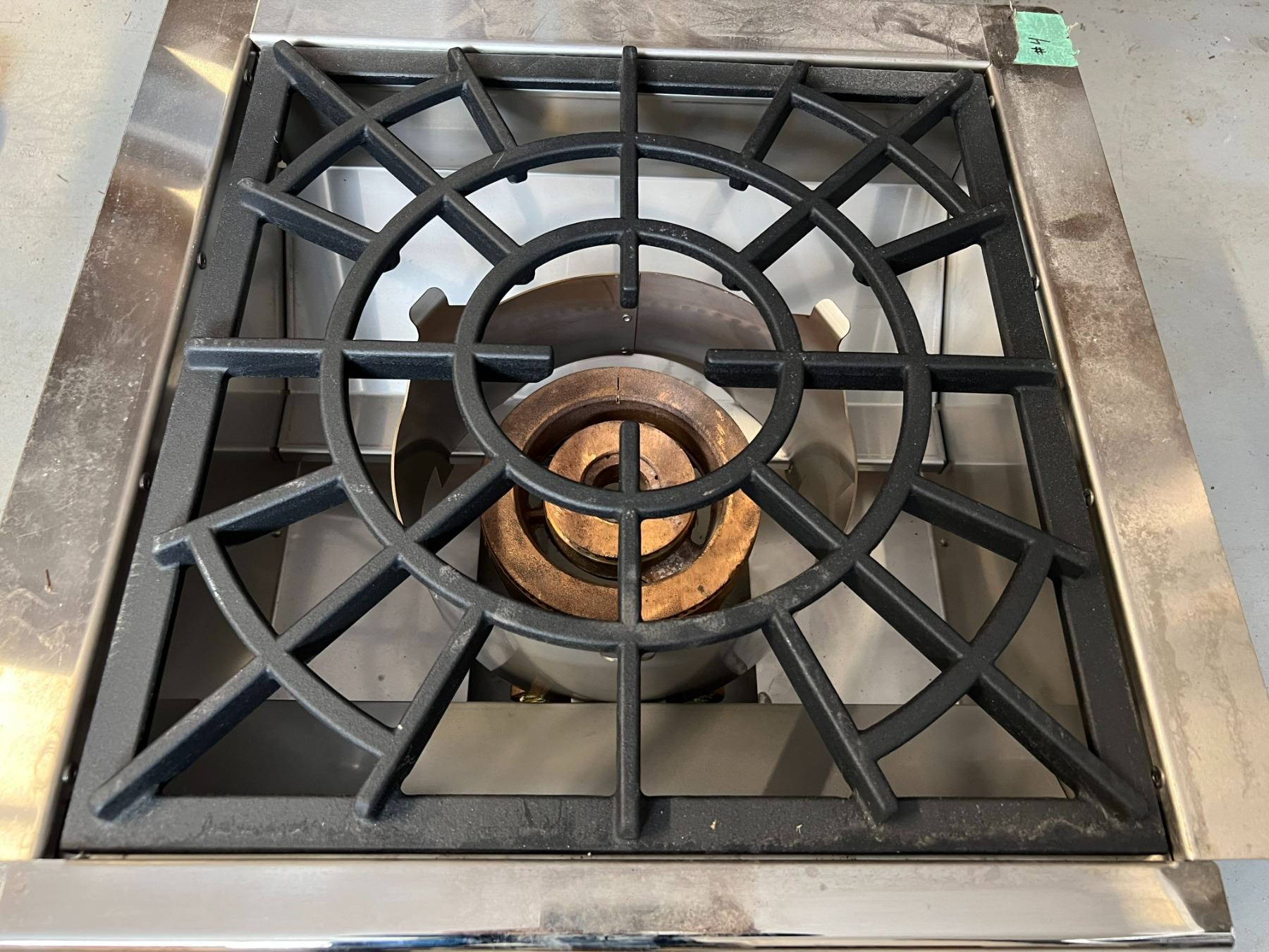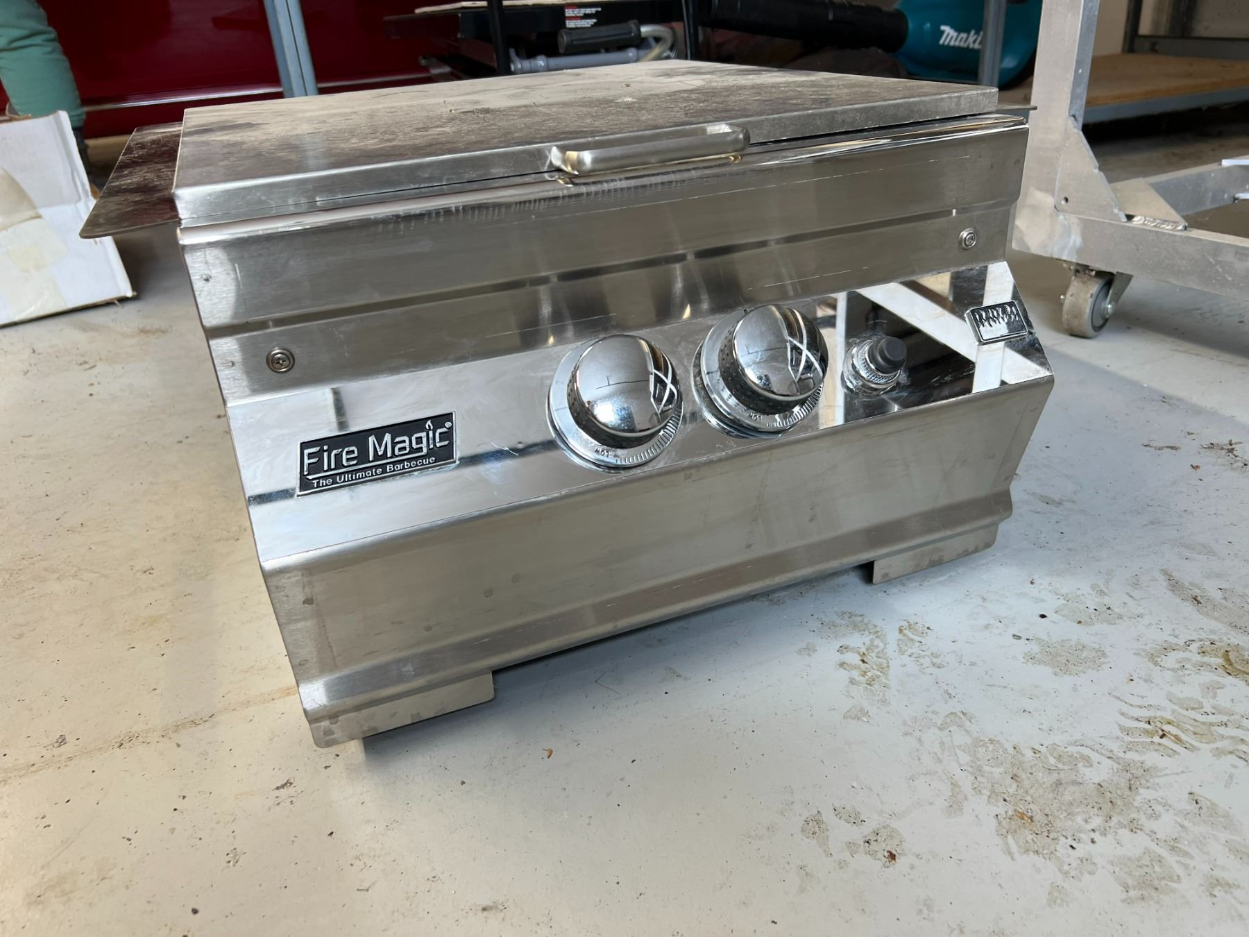 FIRE MAGIC STAINLESS STEEL SIDE BURNER. LARGE ELEMENT FOR KETTLES, CANNING, CRAB POT? 2 CONTROLS FOR INNER AND OUTER BURNER. WIDTH 19"