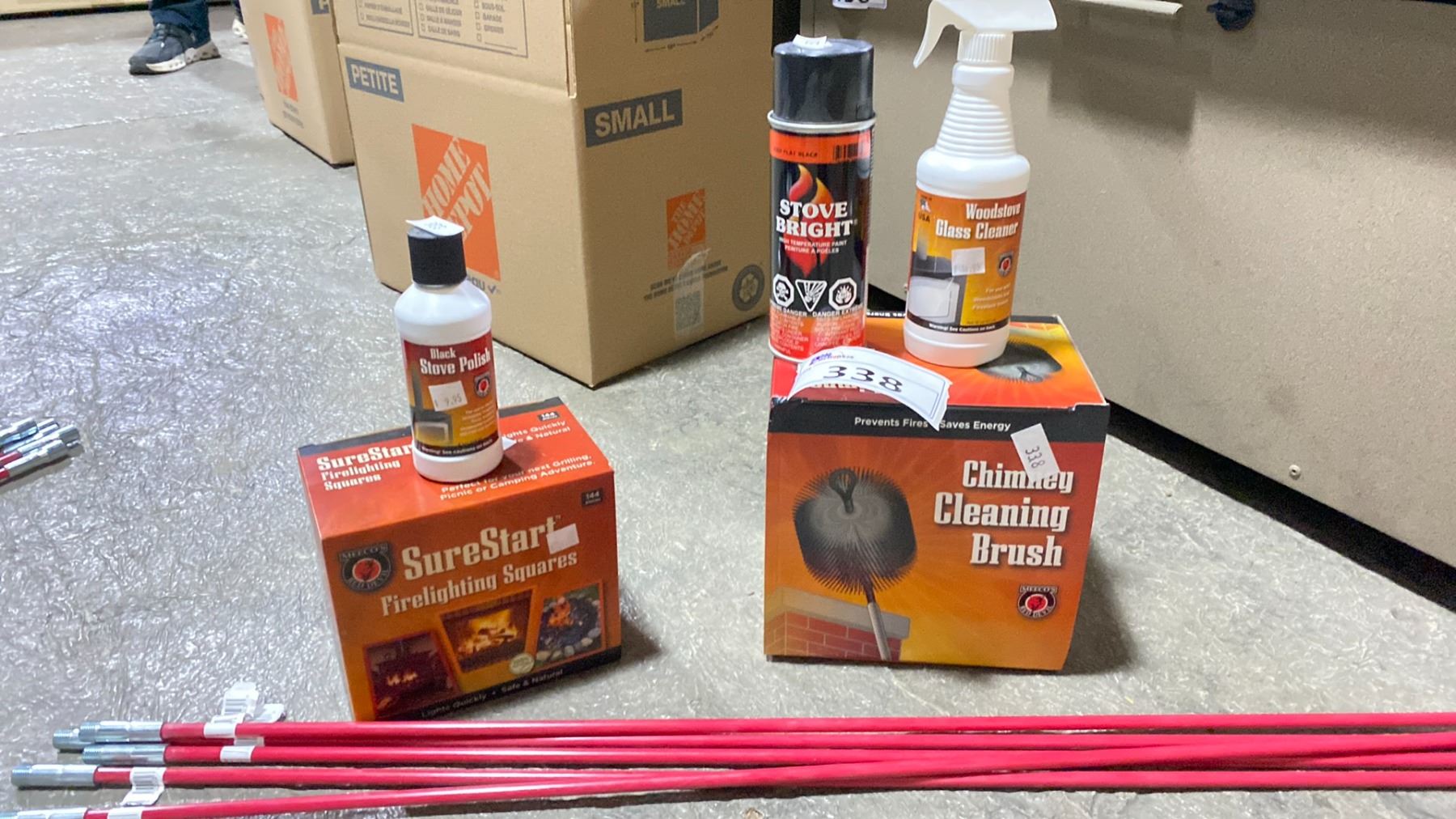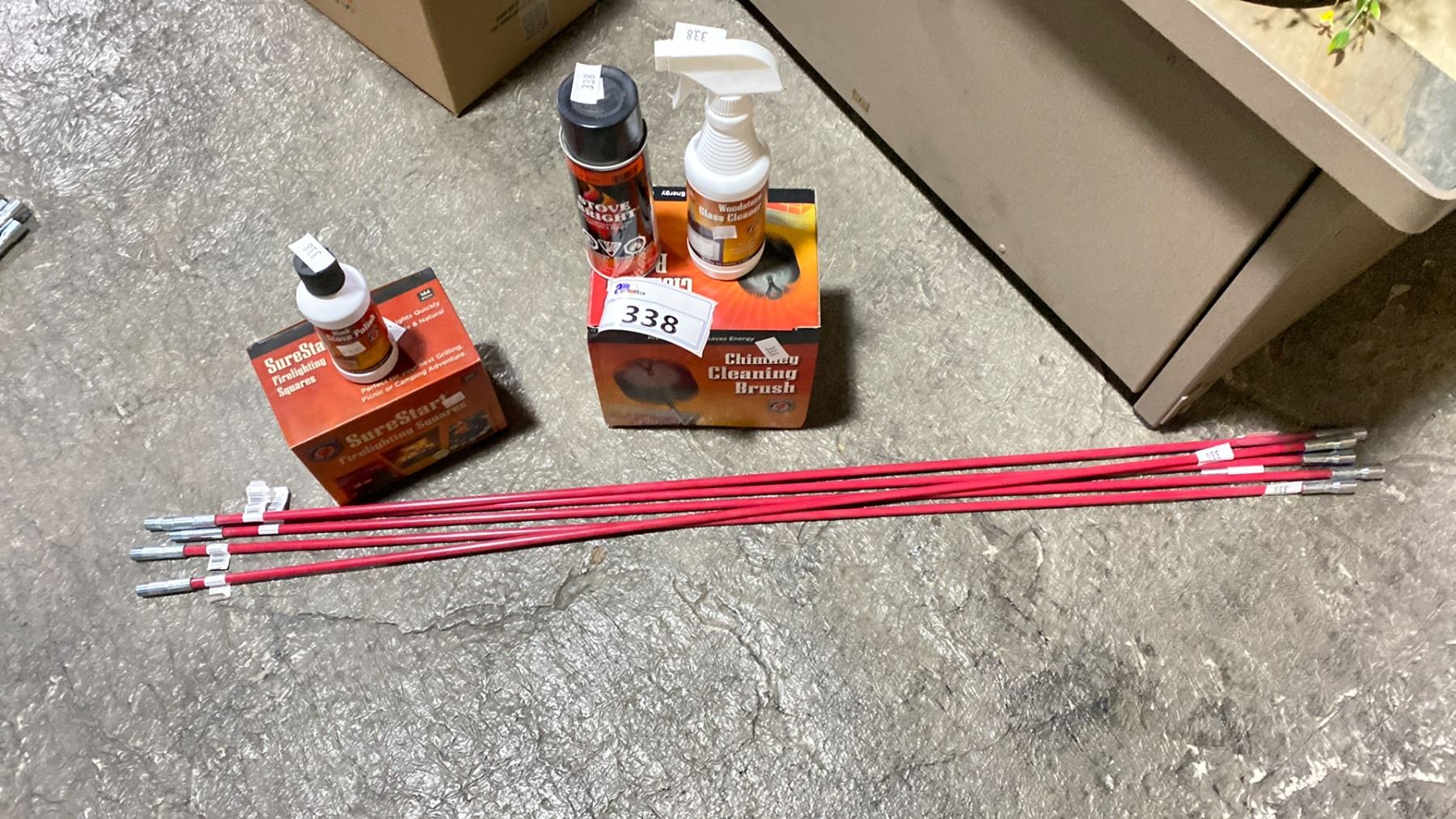 FIREPLACE CARE KIT. 20' CLEANING RODS, 6" CHIMNEY BRUSH, FIREPLACE GLASS CLEANER, FIREPLACE TOUCH UP PAINT, BLACK STOVE POLISH, SURESTART FIRE LIGHTING SQUARES