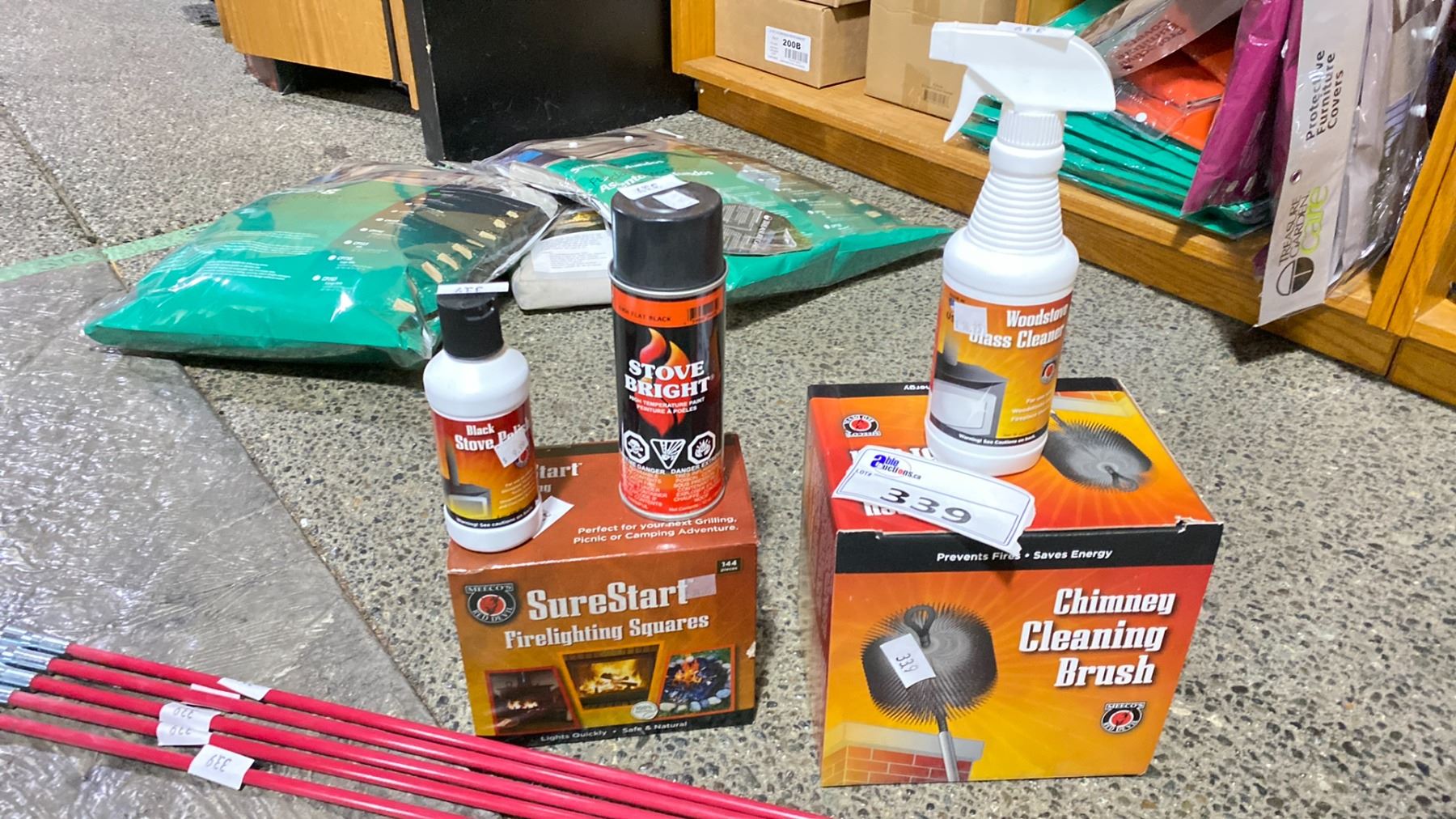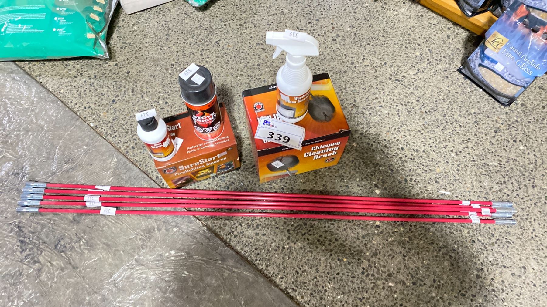 FIREPLACE CARE KIT. 20' CLEANING RODS, 6" CHIMNEY BRUSH, FIREPLACE GLASS CLEANER, FIREPLACE TOUCH UP PAINT, BLACK STOVE POLISH, SURESTART FIRE LIGHTING SQUARES