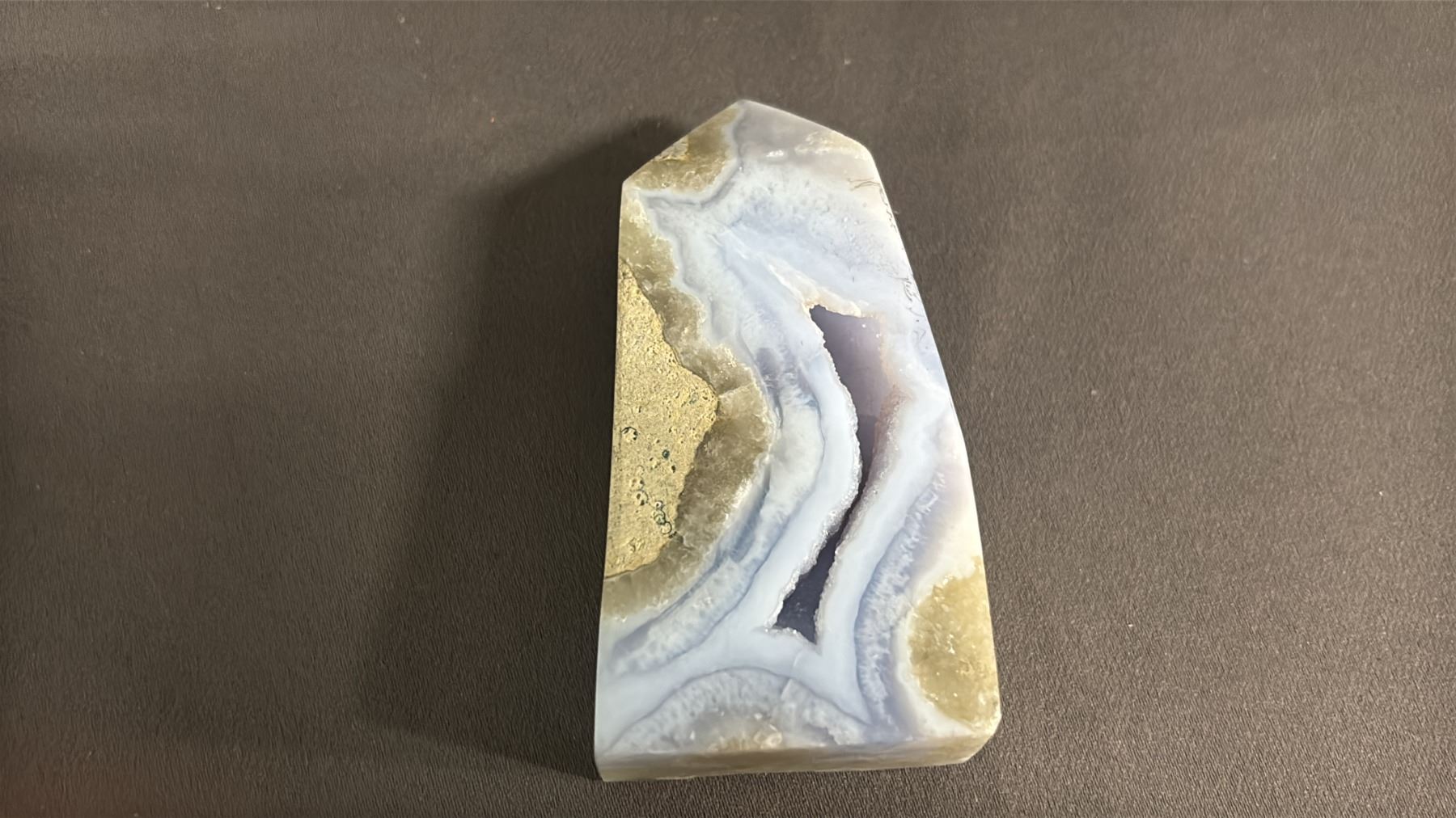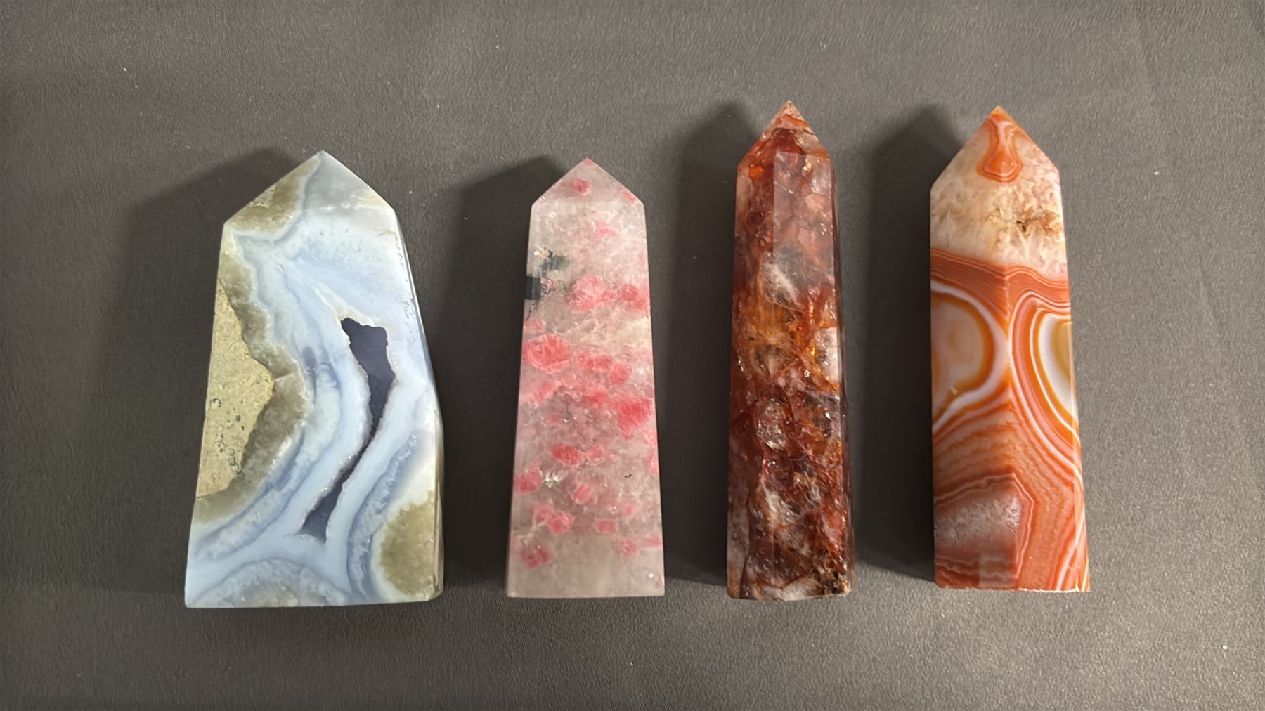 FIRESTONE QUARTZ, RHODONITE, CARNELIAN & BLUE LACE AGATE GEODE TOWERS: LARGEST IS APPROX. 4" TALL