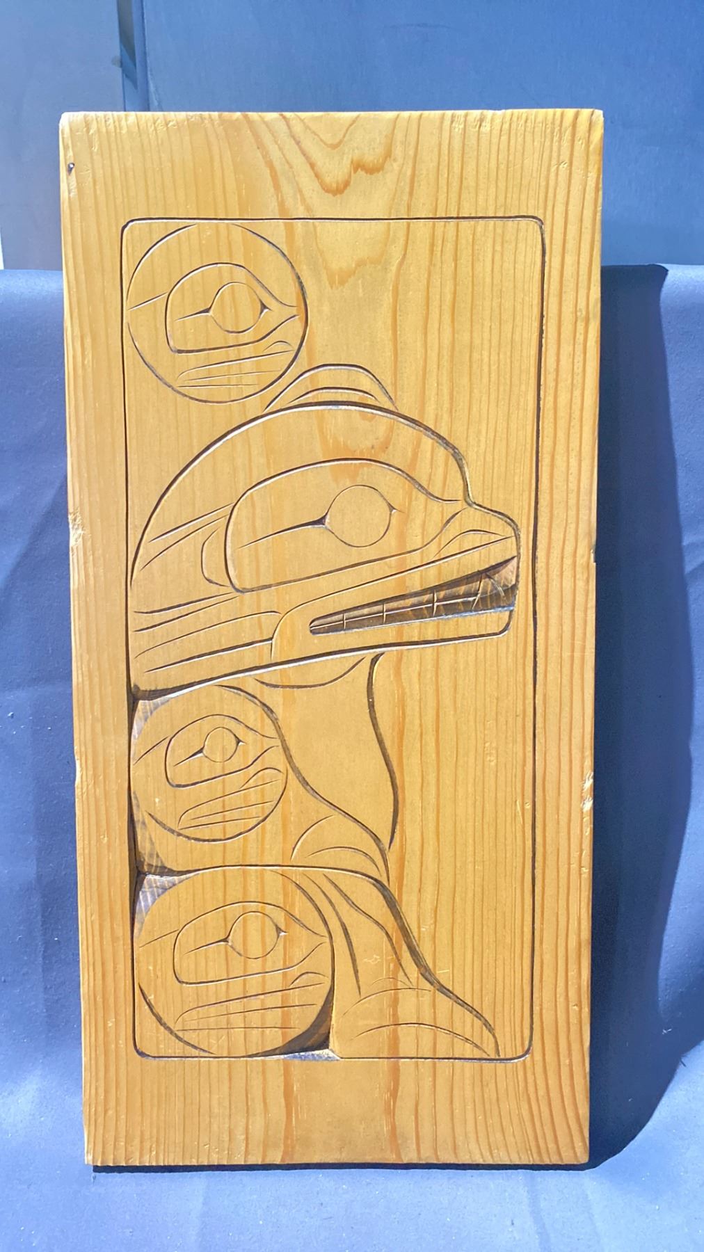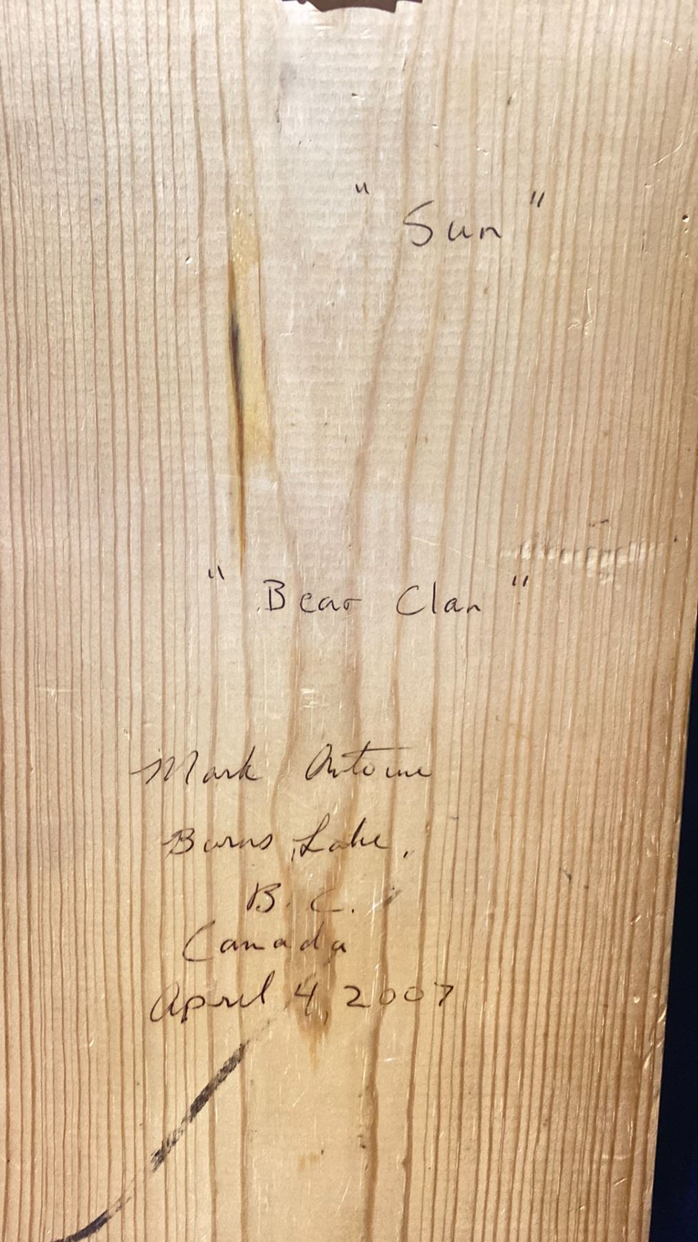 FIRST NATIONS CARVED WOODEN PLANK "SUN - BEAR CLAN" APPROX. 19" X 9" SIGNED
