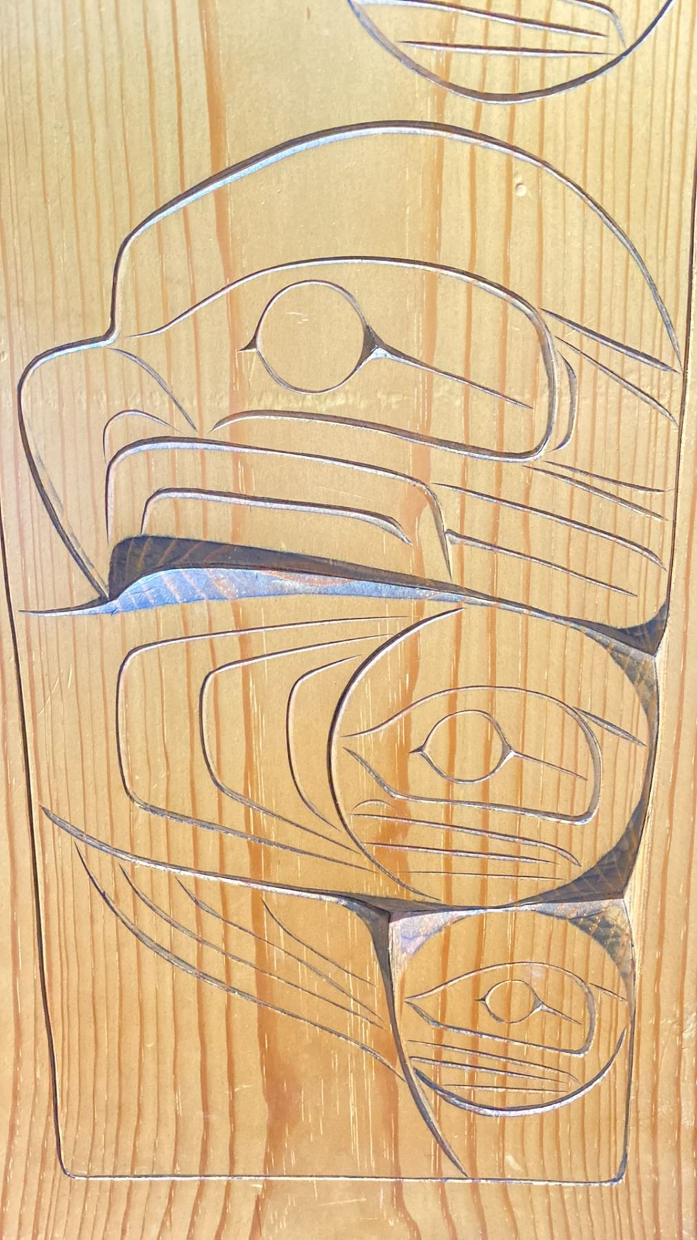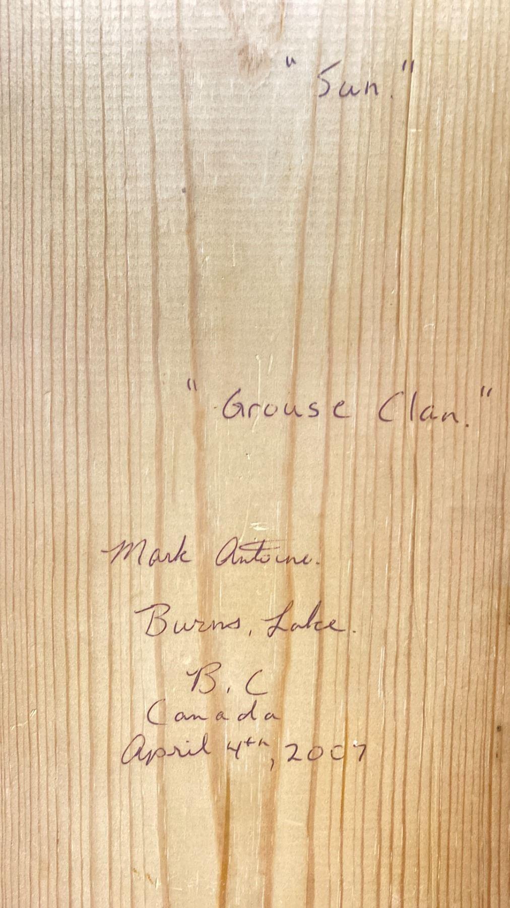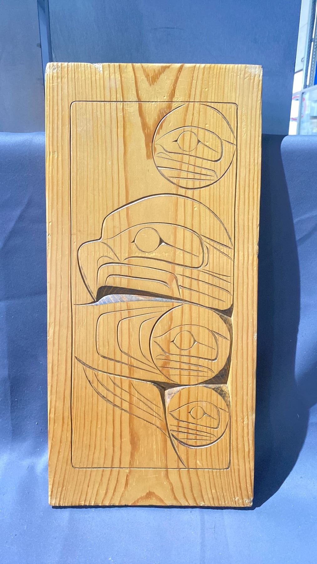 FIRST NATIONS CARVED WOODEN PLANK "SUN - GROUSE CLAN" APPROX. 19" X 9" SIGNED
