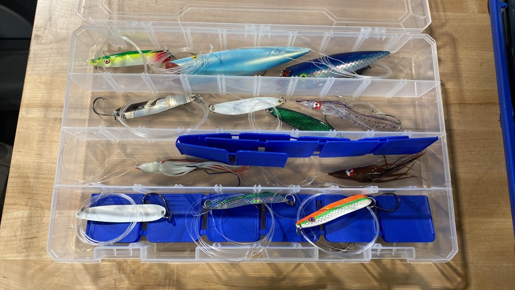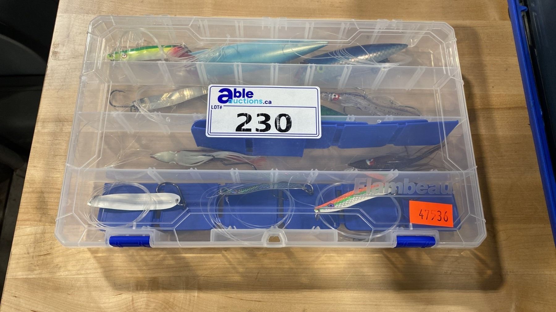 FLAMBEAU CLEAR PLASTIC SORTING CASE WITH ASSORTED NEW FISHING LURES / HOOKS / SPINNERS *SORTING CASE INCLUDED*