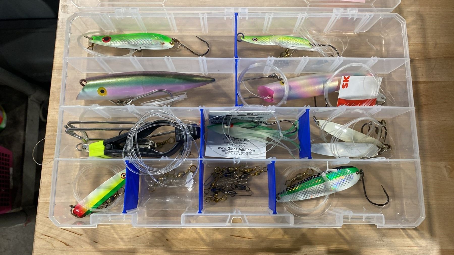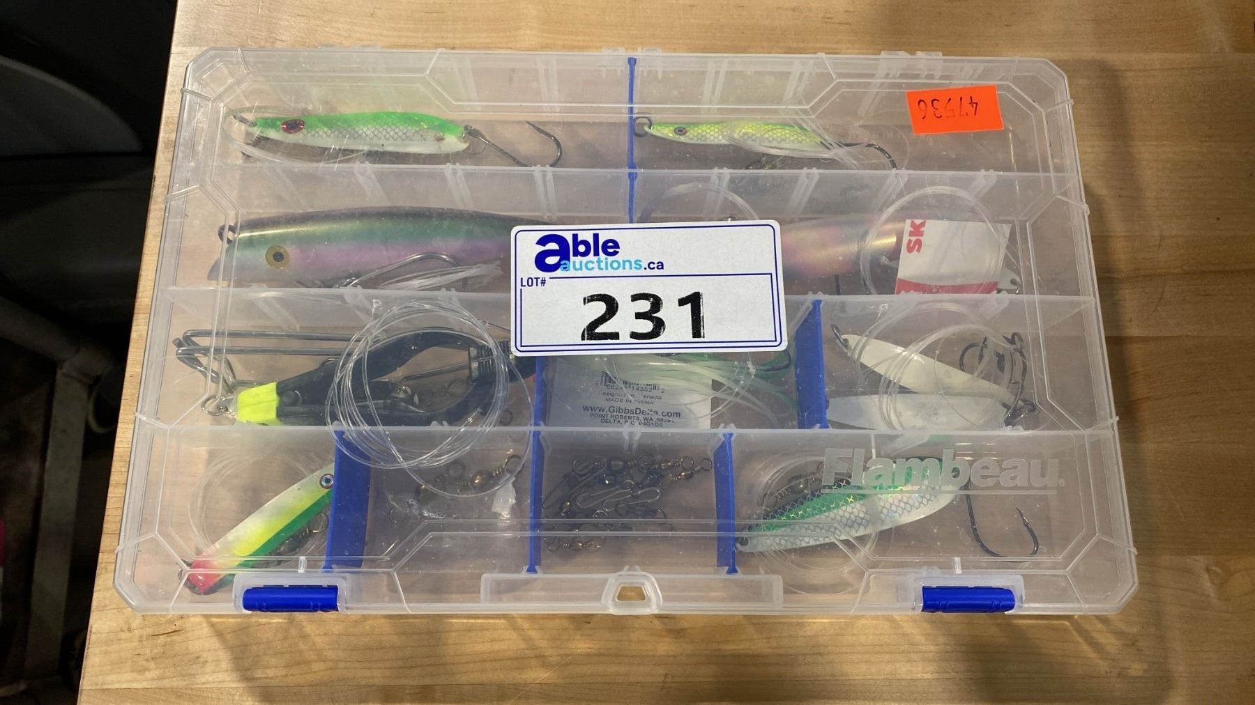 FLAMBEAU CLEAR PLASTIC SORTING CASE WITH ASSORTED NEW FISHING LURES / HOOKS / SPINNERS *SORTING CASE INCLUDED*