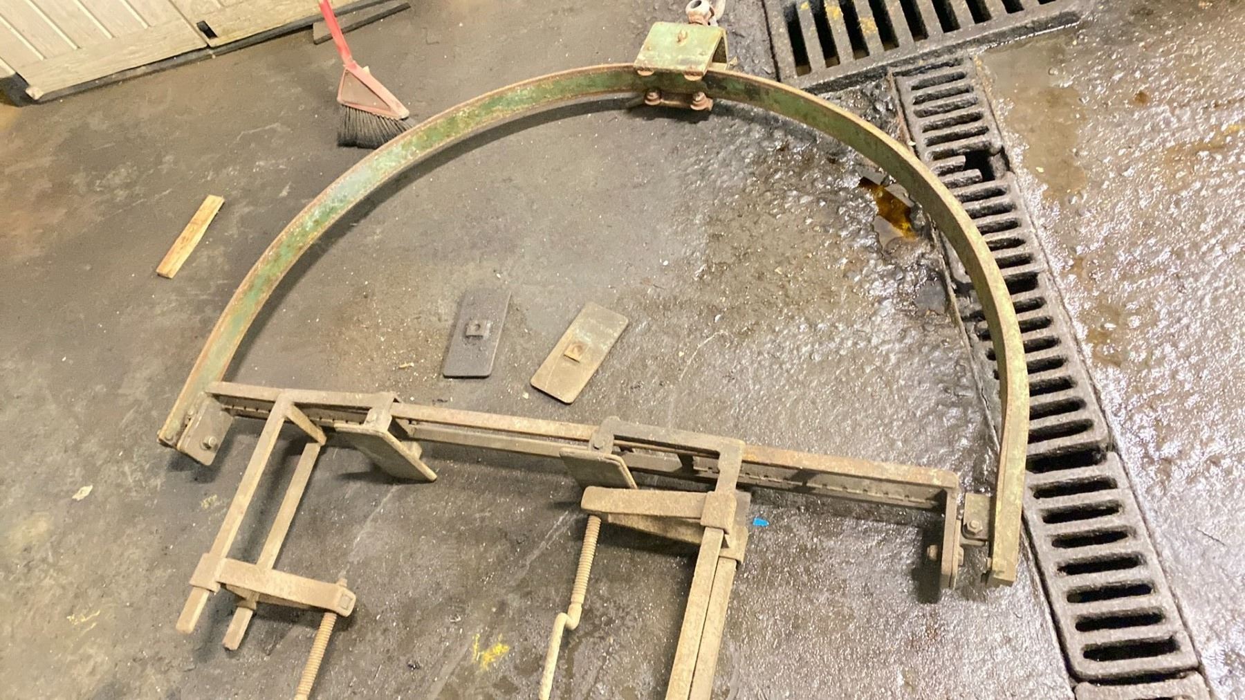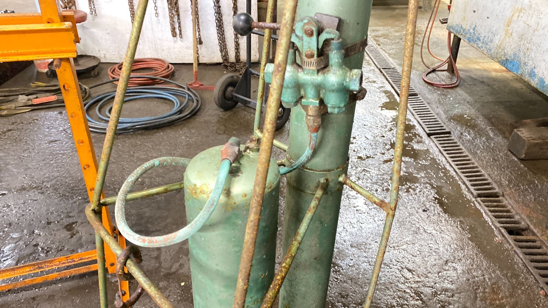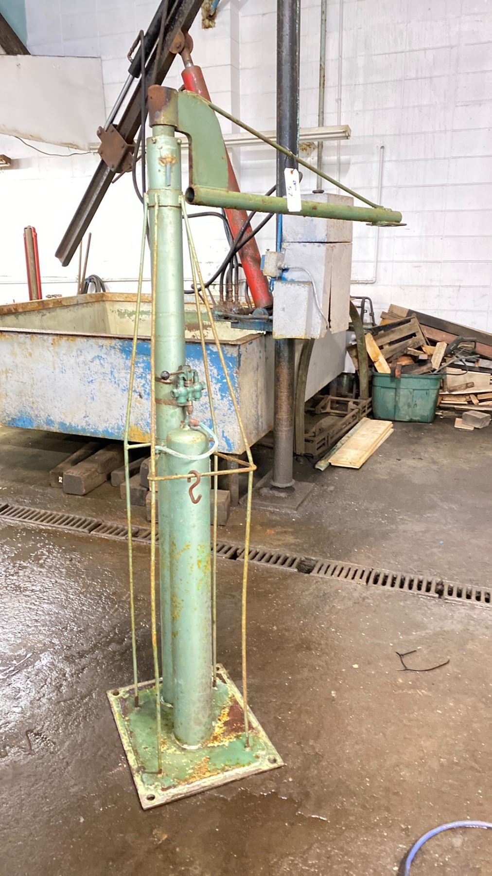 FLOOR MOUNTED PNEUMATIC/HYDRAULIC HOIST. APPROX 56"-100" RANGE. COMES WITH HOOP LIFTER