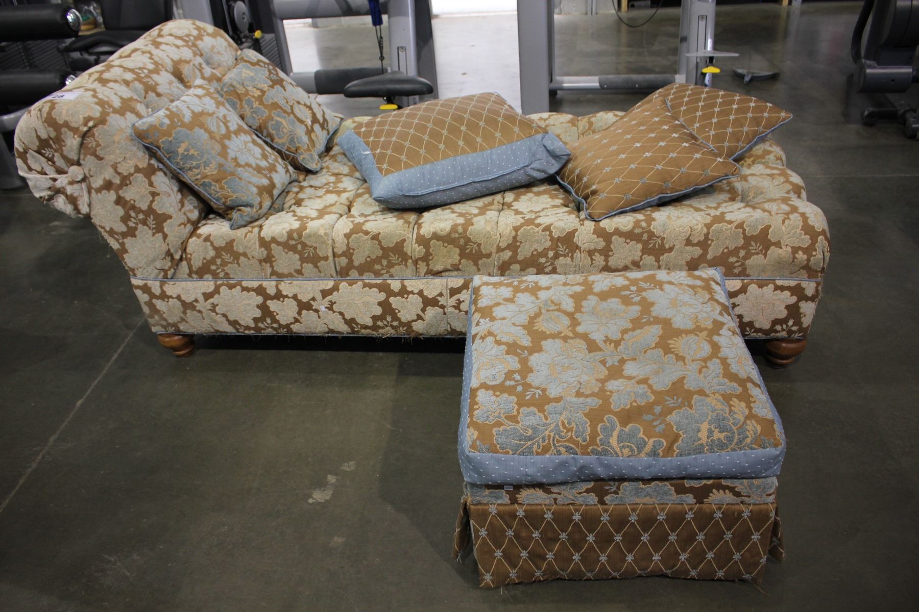 FLORAL UPHOLSTERED CHAISE LOUNGE WITH PILLOWS AND FOOTSTOOL