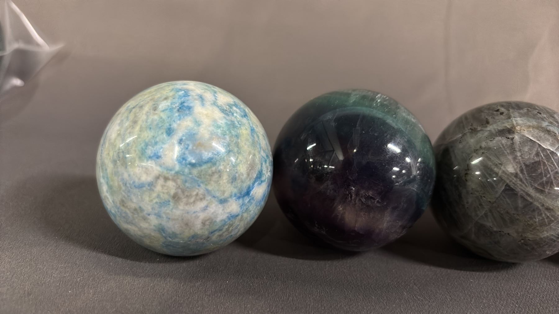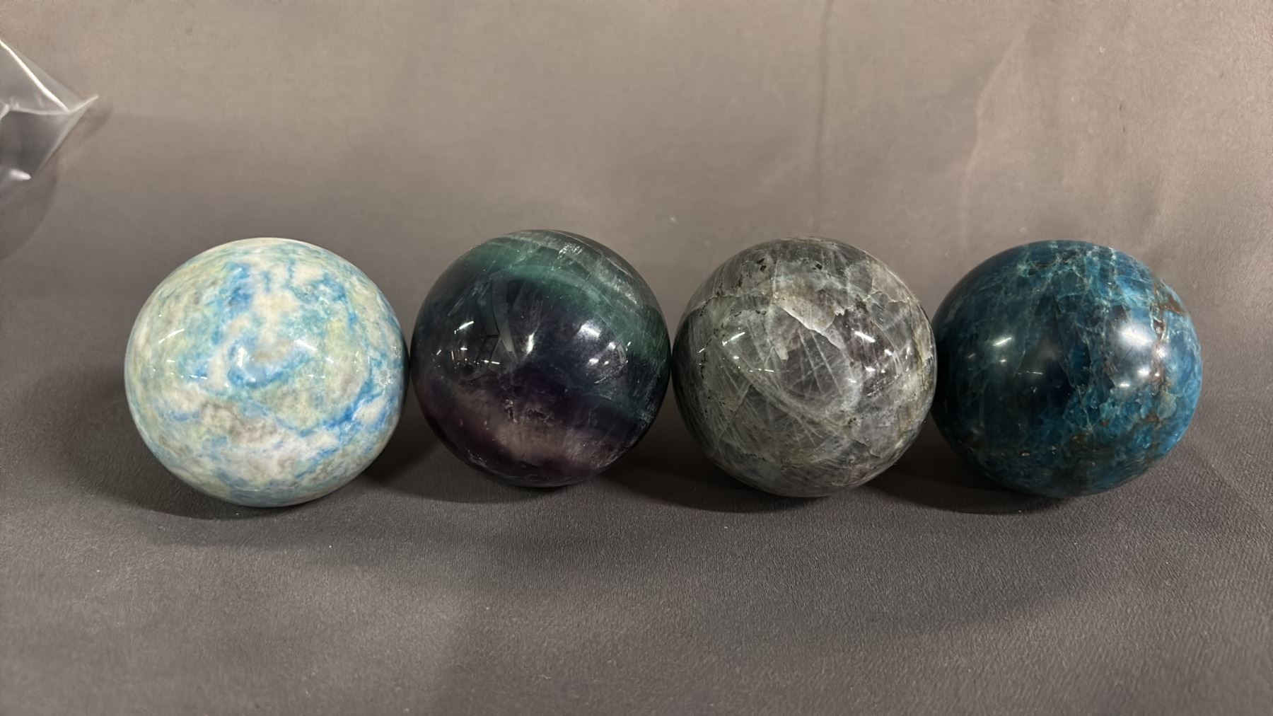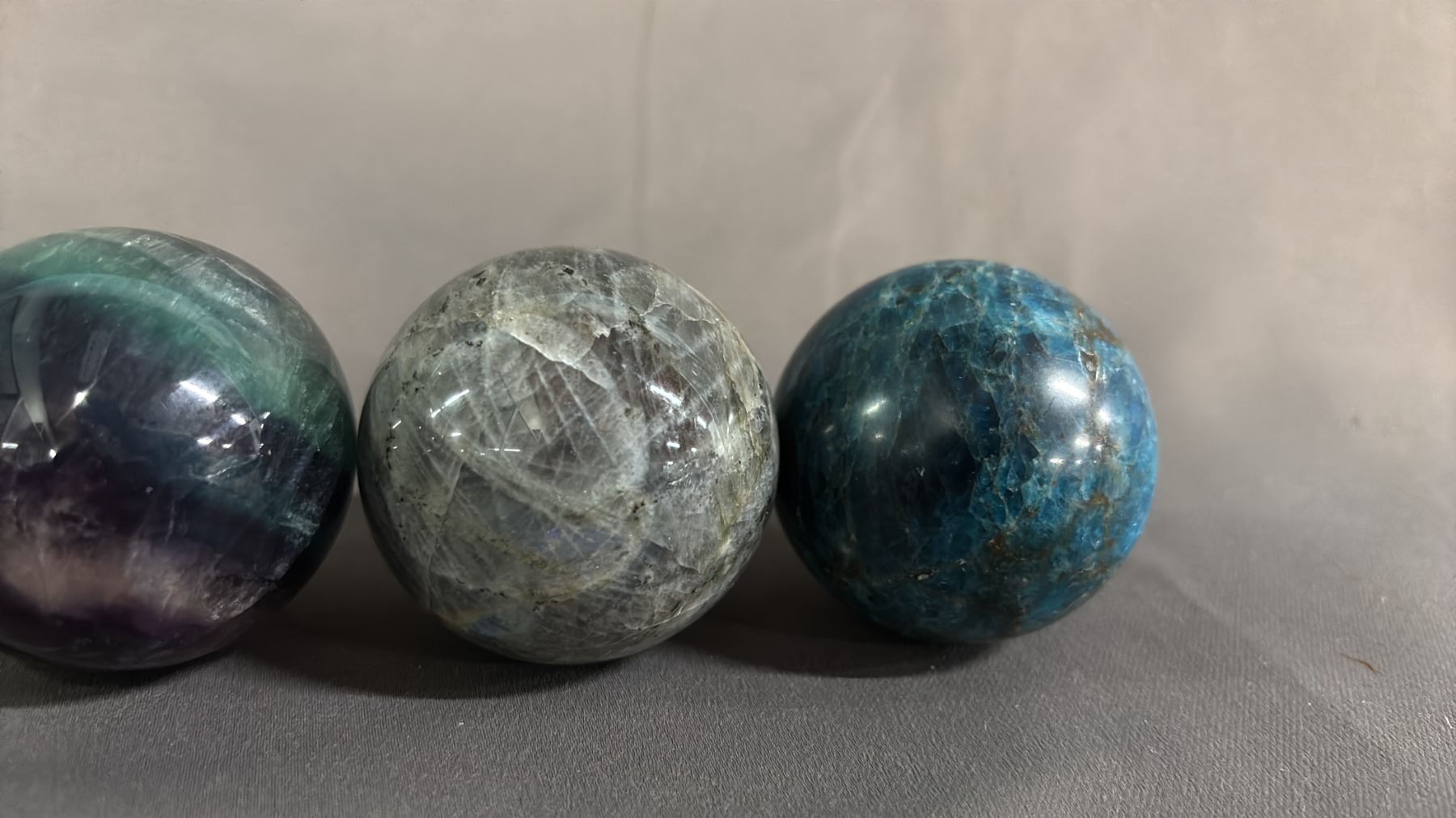 FLUORITE, GREY MOONSTONE & (2) BLUE APATITE, 2" SPHERES