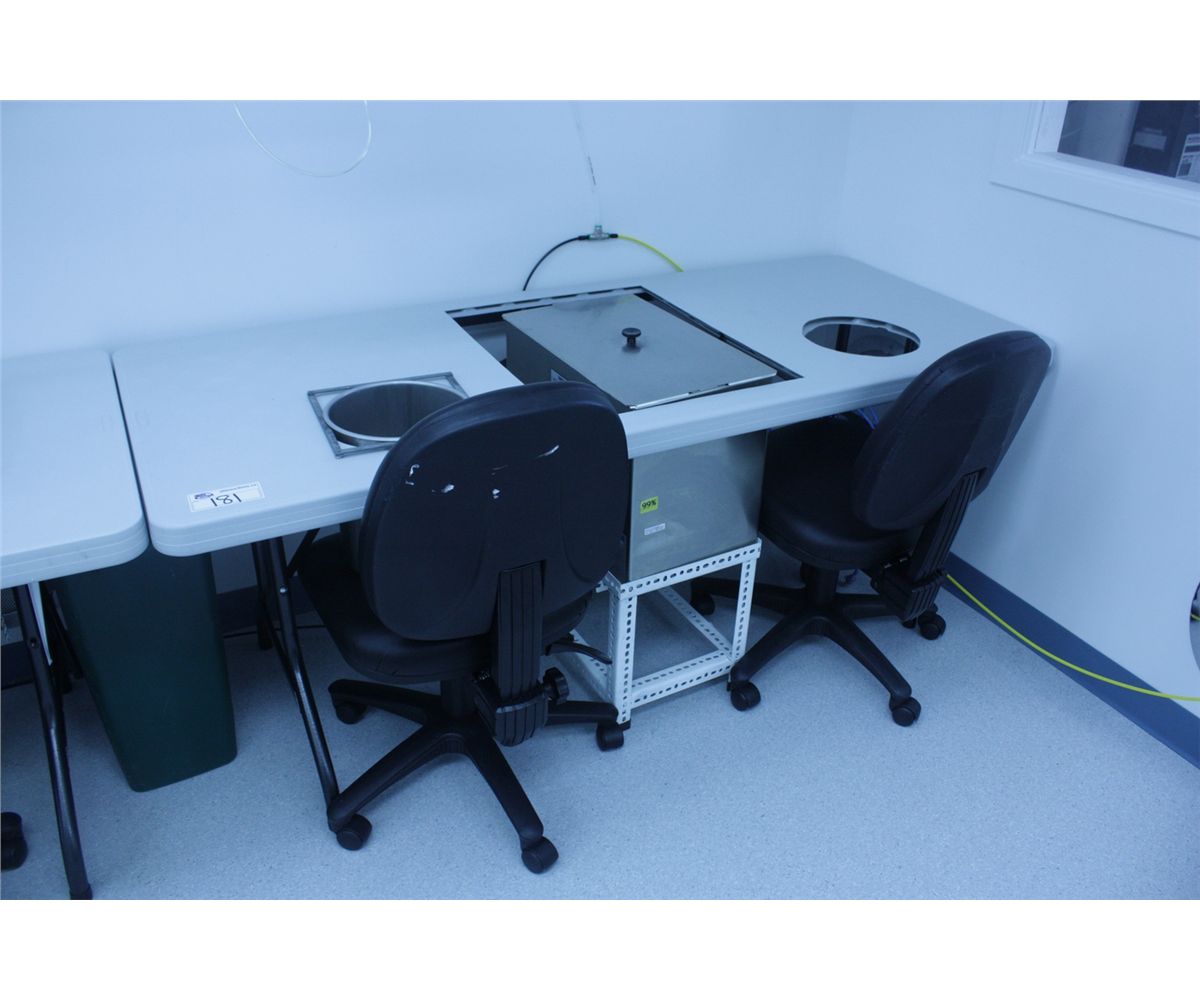 FOLDABLE MEDICAL WORK STATION WITH 2 CHAIRS AND VWR SCIENTIFIC MODEL 750T STAINLESS STEEL WATER BATH