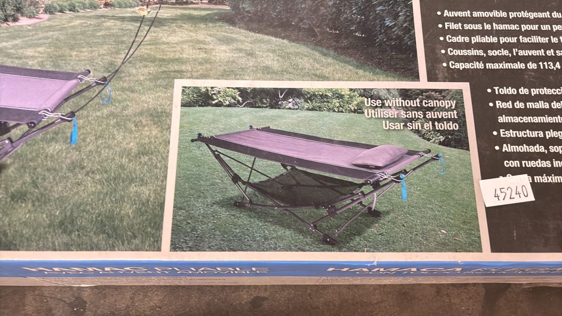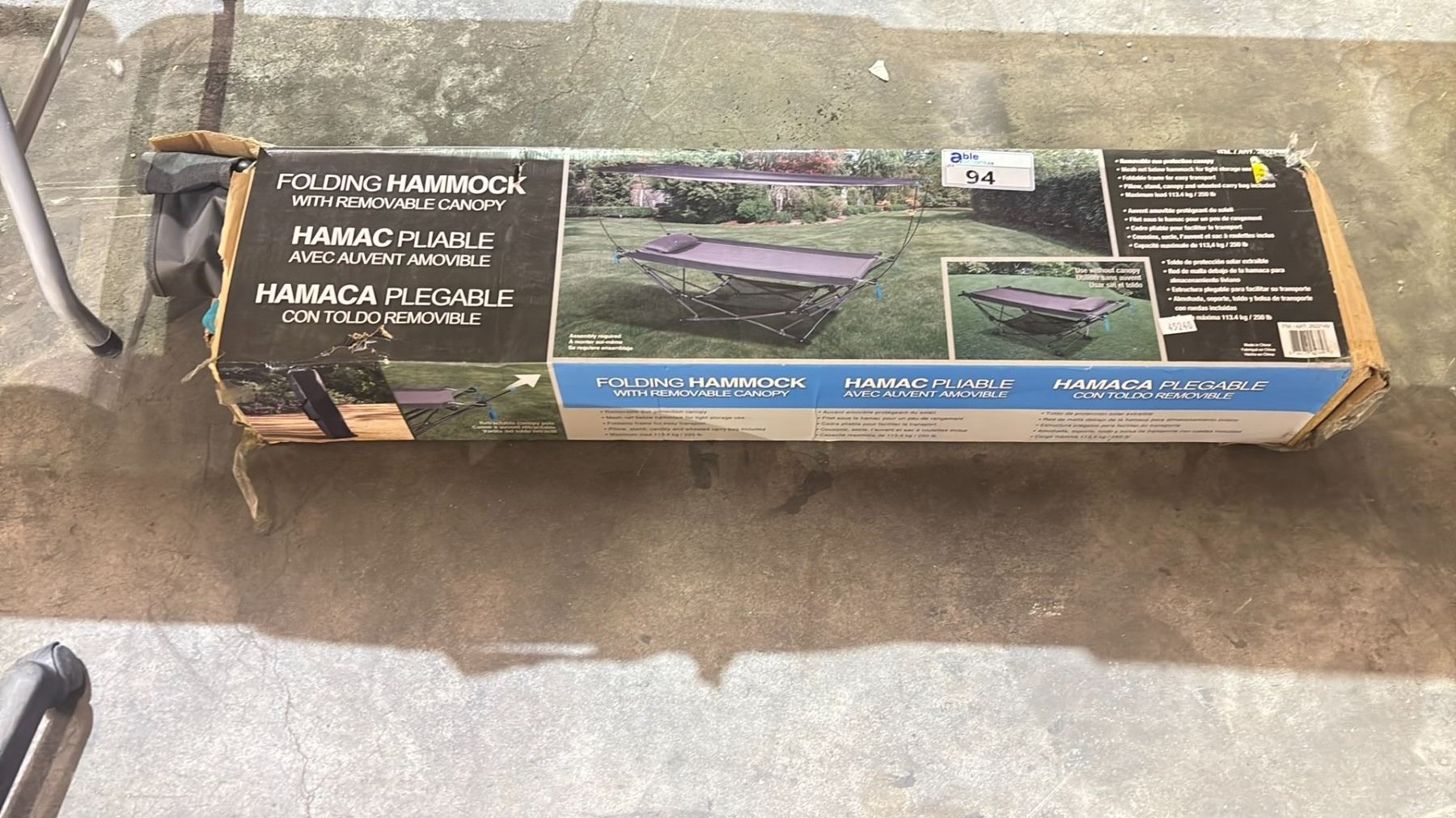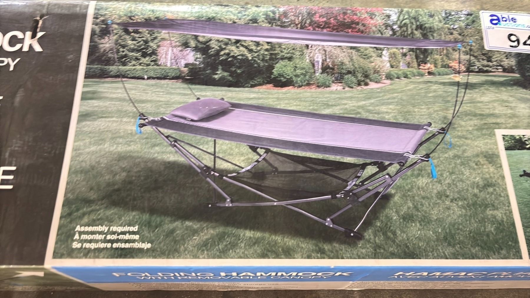 FOLDING HAMMOCK WITH REMOVABLE CANOPY AND A MAXIMUM CAPACITY OF 250LBS *WORKING CONDITION UNKNOWN/MAY BE MISSING PARTS AND/OR PIECES*