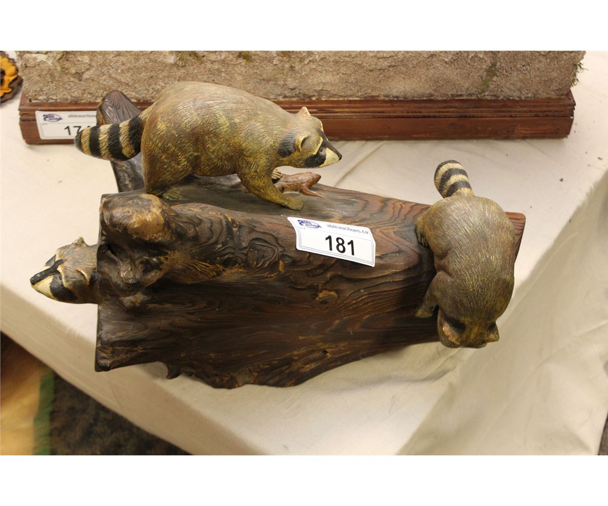 FOLK ART CARVING OF RACCOON'S ON LOG