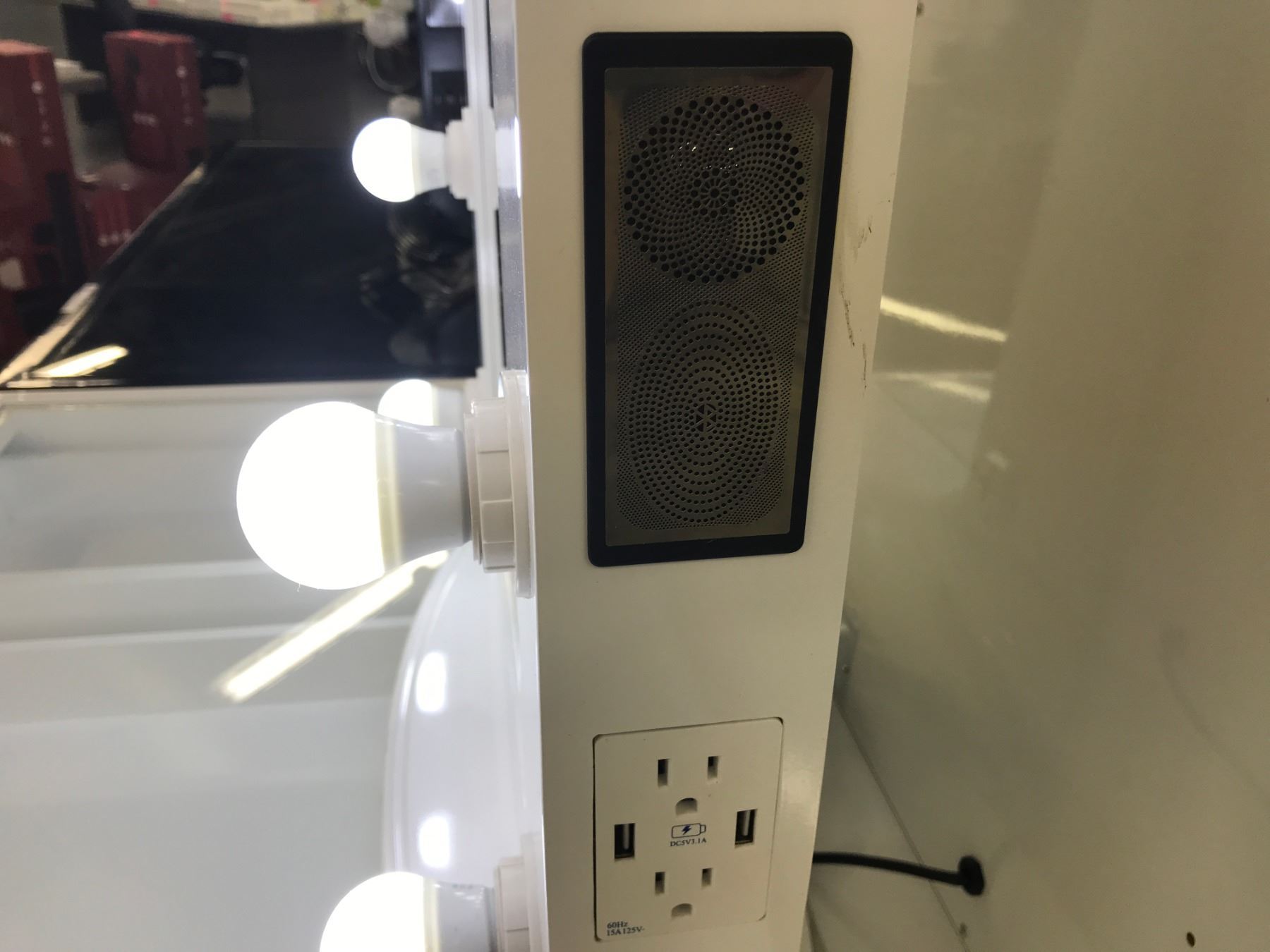 FONTAINEBLEAU "HOLLYWOOD" VANITY MIRROR WITH BLUETOOTH SPEAKERS, TOUCH CONTROLS, 10 DIMMABLE DAYLIGHT LED BULBS, 2 SIDE MOUNTED POWER OUTLETS, 2 USB OUTLETS, REMOVABLE BASE AND WALL MOUNTING POINTS ON REAR, 19.5" WIDE X 25.5" TALL X 3" DEEP (WITHOUT STAND), WHITE BASE AND BORDER