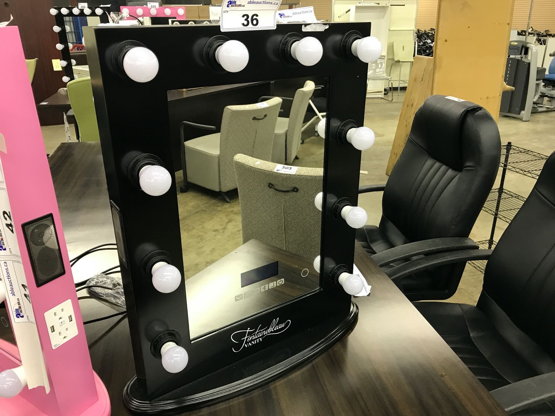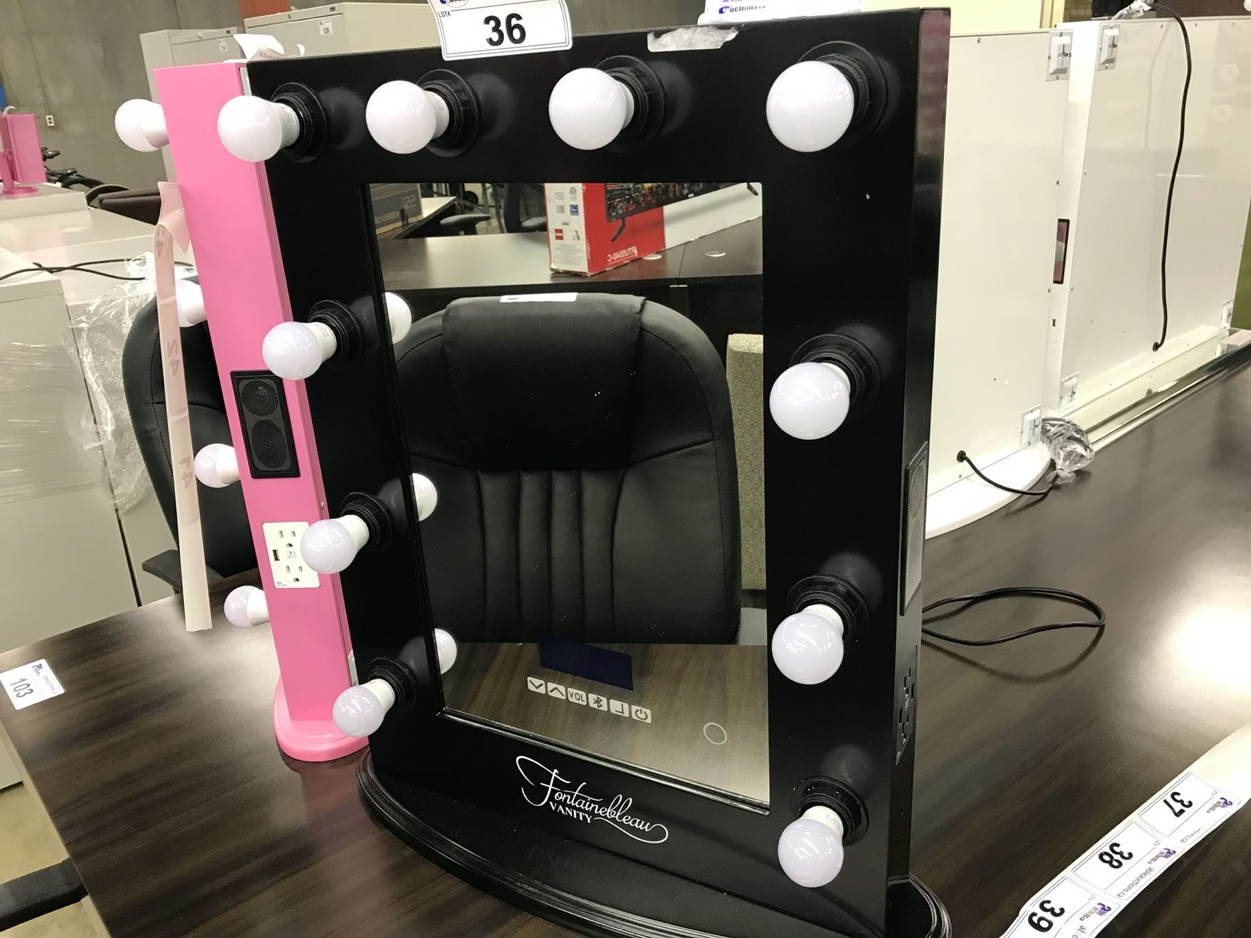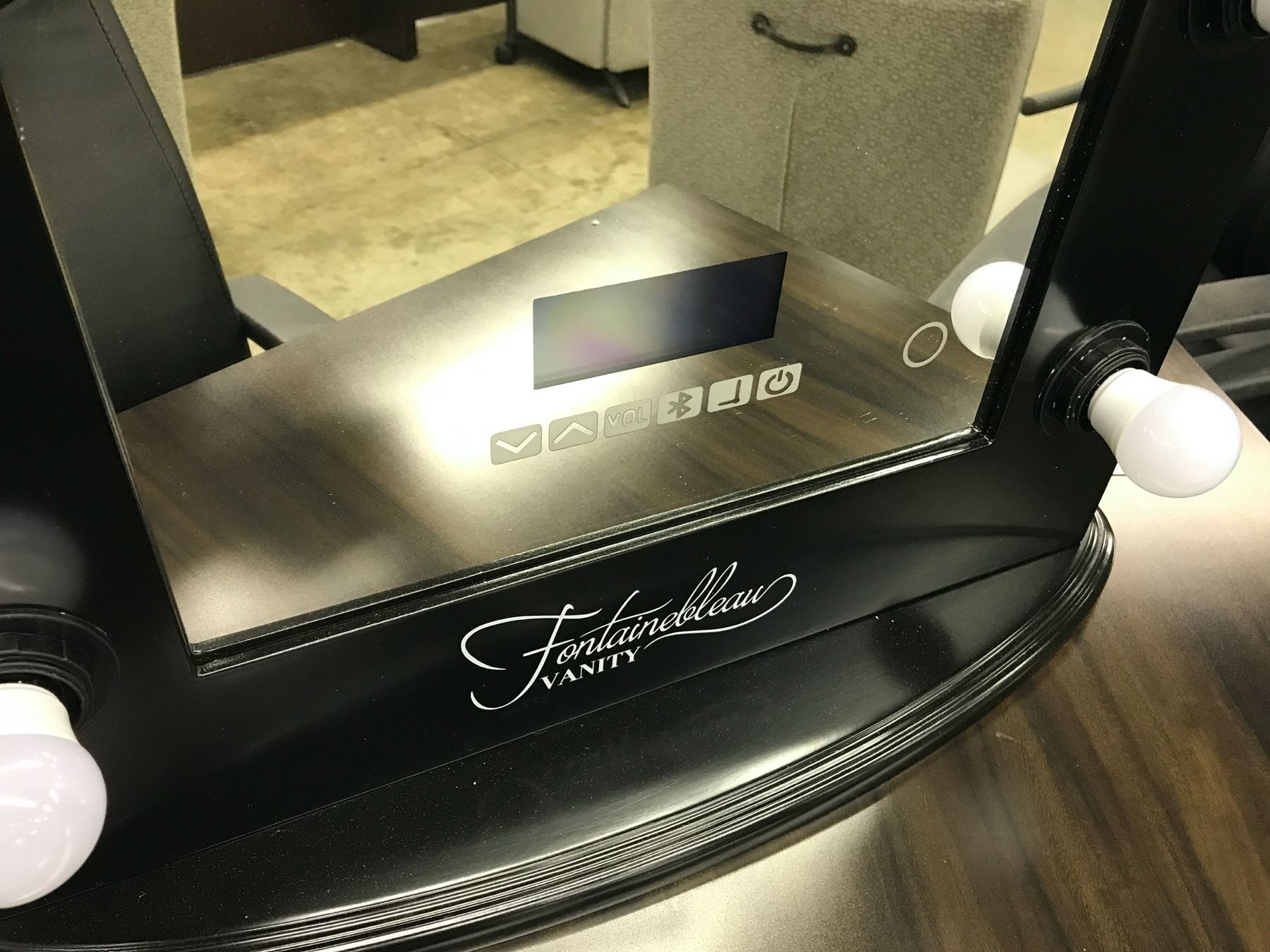 FONTAINEBLEAU "HOLLYWOOD" VANITY MIRROR WITH BLUETOOTH SPEAKERS, TOUCH CONTROLS, 10 DIMMABLE DAYLIGHT LED BULBS, 2 SIDE MOUNTED POWER OUTLETS, 2 USB OUTLETS, REMOVABLE BASE AND WALL MOUNTING POINTS ON REAR, 19.5" WIDE X 25.5" TALL X 3" DEEP (WITHOUT STAND), BLACK BASE AND BORDER