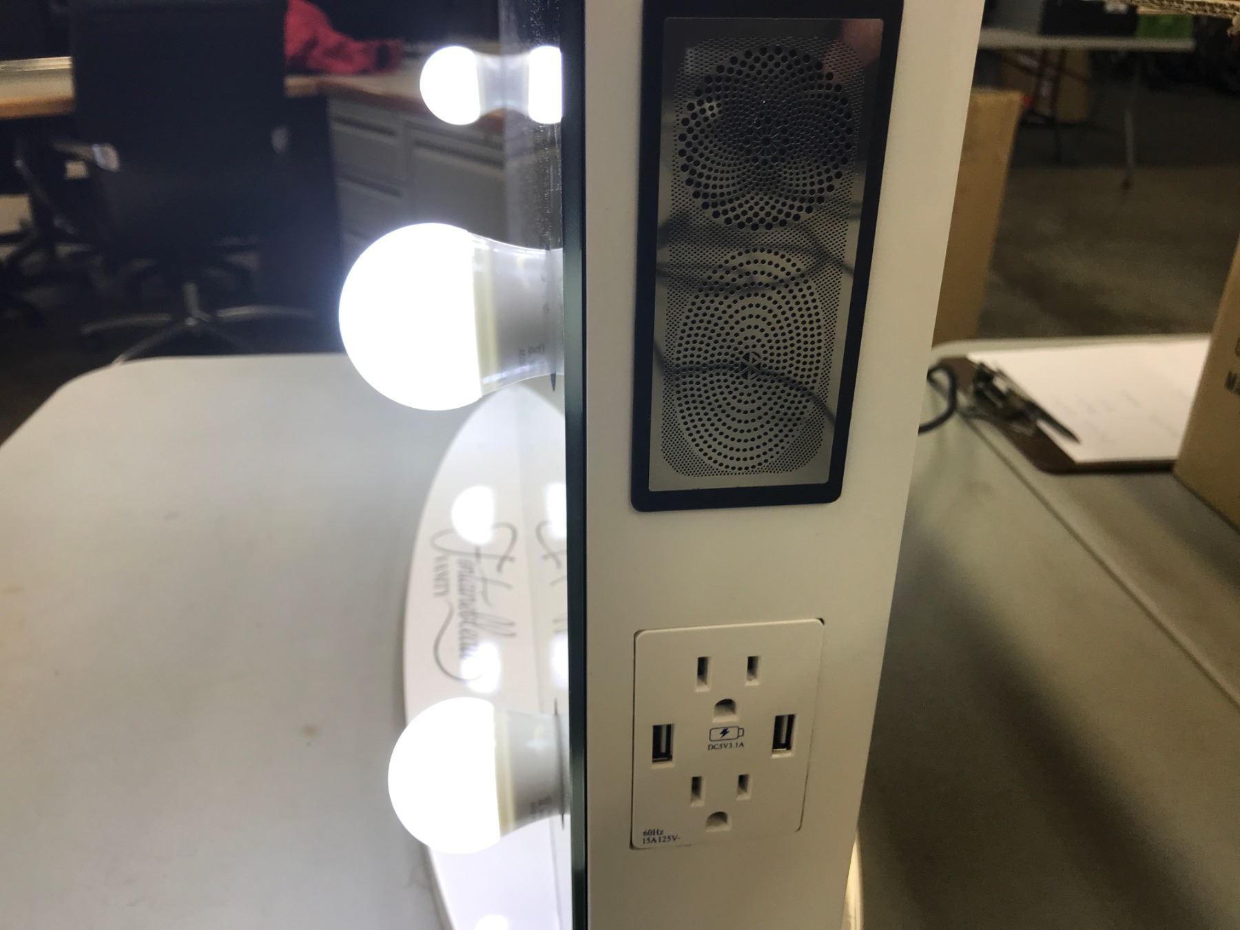 FONTAINEBLEAU "HOLLYWOOD" VANITY MIRROR WITH BLUETOOTH SPEAKERS, TOUCH CONTROLS, 8 DIMMABLE DAYLIGHT LED BULBS, 2 SIDE MOUNTED POWER OUTLETS, 2 USB OUTLETS, REMOVABLE BASE AND WALL MOUNTING POINTS ON REAR, 22" WIDE X 17" TALL X 3" DEEP (WITHOUT STAND), SEAMLESS FRAME AND WHITE BASE