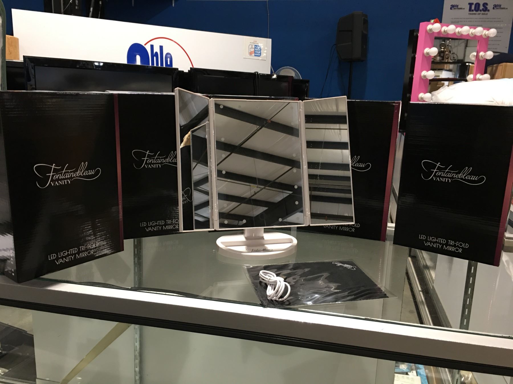 FONTAINEBLEAU LED LIGHTED TRI-FOLD VANITY MIRRORS - ULTRA BRIGHT 21PCS LEDS, PERFECT FOR MAKEUP USE, 3 PANELS PROVIDE WIDE-ANGLE VIEWING, ADJUSTS 180 DEGREES FOR THE BEST ANGLE, TOUCH CONTROL ON/OFF, POWERED BY 4 AAA BATTERY (INCLUDED OR CONNECT POWER SUPPLY BY PROVIDED USB CABLE, INCLUDES CLEANING CLOTH - WHITE GROUP OF 6- B