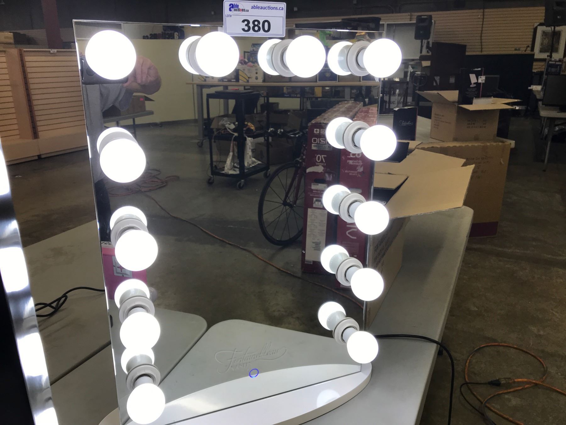 FONTAINEBLEAU VANITY MIRROR WITH TOUCH CONTROLS, 12 DIMMABLE DAYLIGHT LED BULBS, 2 SIDE MOUNTED POWER OUTLETS, REMOVABLE BASE AND WALL MOUNTING POINTS ON REAR, 19 3/4" WIDE X 27.5" TALL X 3" DEEP (WITHOUT STAND), SEAMLESS BORDER AND WHITE BASE