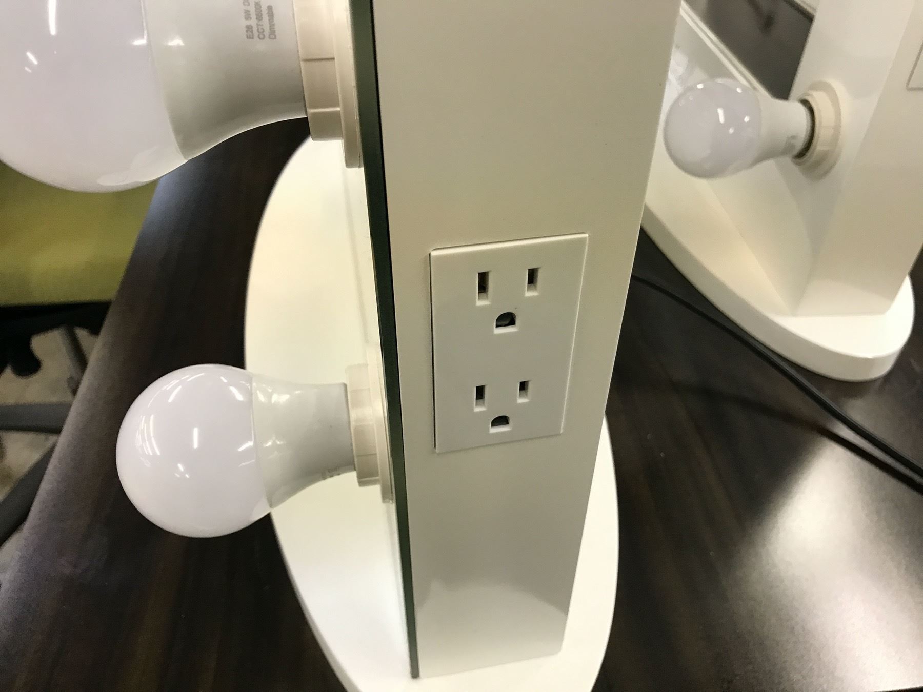 FONTAINEBLEAU VANITY MIRROR WITH TOUCH CONTROLS, 12 DIMMABLE DAYLIGHT LED BULBS, 2 SIDE MOUNTED POWER OUTLETS, REMOVABLE BASE AND WALL MOUNTING POINTS ON REAR, 19 3/4" WIDE X 27.5" TALL X 3" DEEP (WITHOUT STAND), SEAMLESS BORDER AND WHITE BASE
