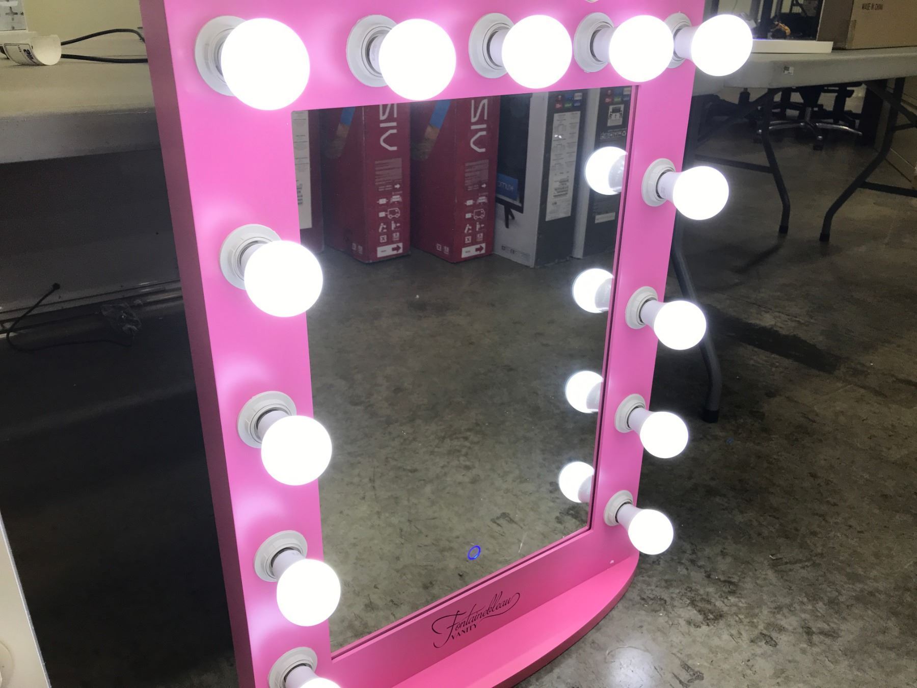 FONTAINEBLEAU VANITY MIRROR WITH TOUCH CONTROLS, 13 DIMMABLE DAYLIGHT LED BULBS, 2 SIDE MOUNTED POWER OUTLETS, REMOVABLE BASE AND WALL MOUNTING POINTS ON REAR, 23.5" WIDE X 31.5" TALL X 3" DEEP (WITHOUT STAND), PINK BORDER AND BASE
