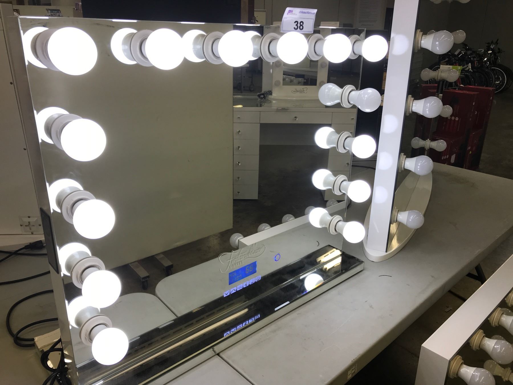 FONTAINEBLEAU VANITY MIRROR WITH TOUCH CONTROLS, 14 DIMMABLE DAYLIGHT LED BULBS, 2 SIDE MOUNTED POWER OUTLETS, 2 USB OUTLETS, REMOVABLE BASE AND WALL MOUNTING POINTS ON REAR, 31.5" WIDE X 25 3/4" TALL X 3" DEEP (WITHOUT STAND), MIRROR BORDER AND BASE