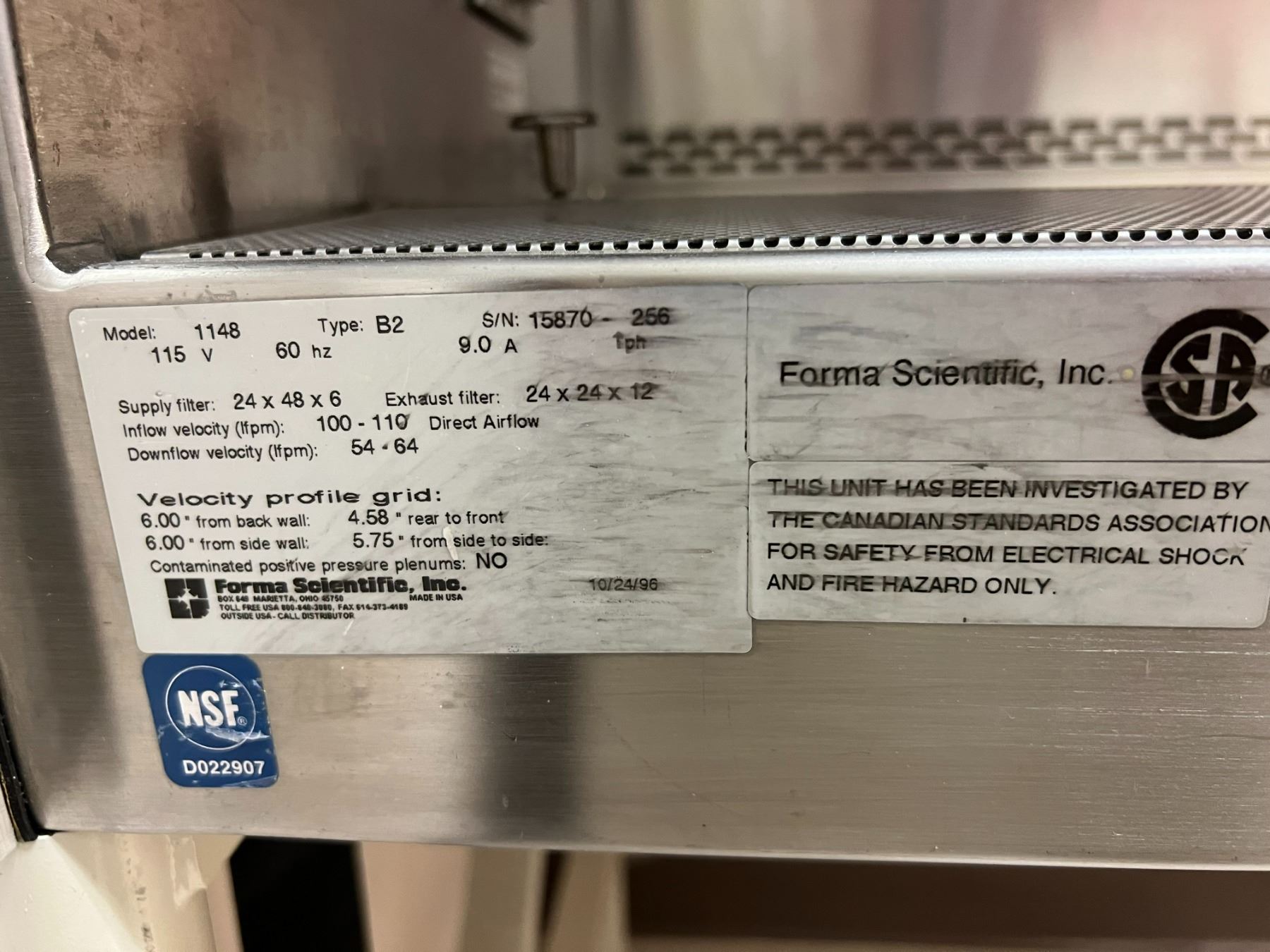FORMA SCIENTIFIC BIOLOGICAL SAFETY CABINET MODEL 1148 - 115V (51" X 32" X 95") - 48" X 24" EXHAUST - 10" EXHAUST VENT - EXHAUST VENT WILL NEED TO DISCONNECTED