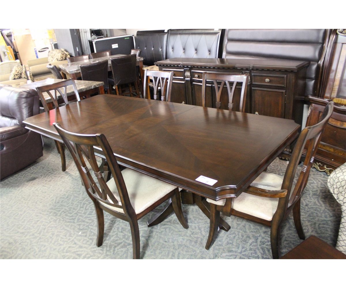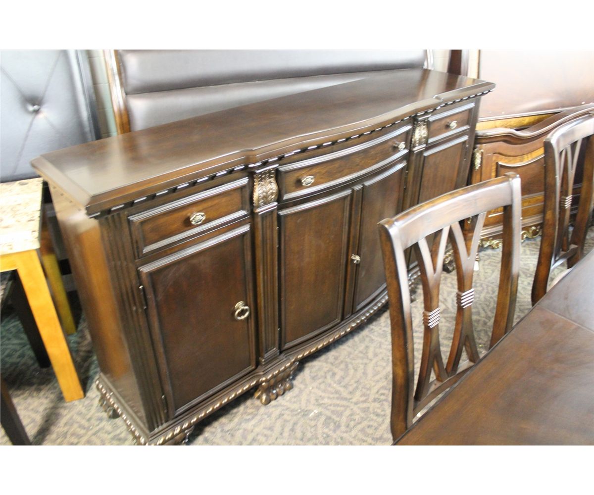 FORMAL DINING ROOM SET WITH DARK WOOD TABLE AND LEAF, BUFFET AND 5 CHAIRS