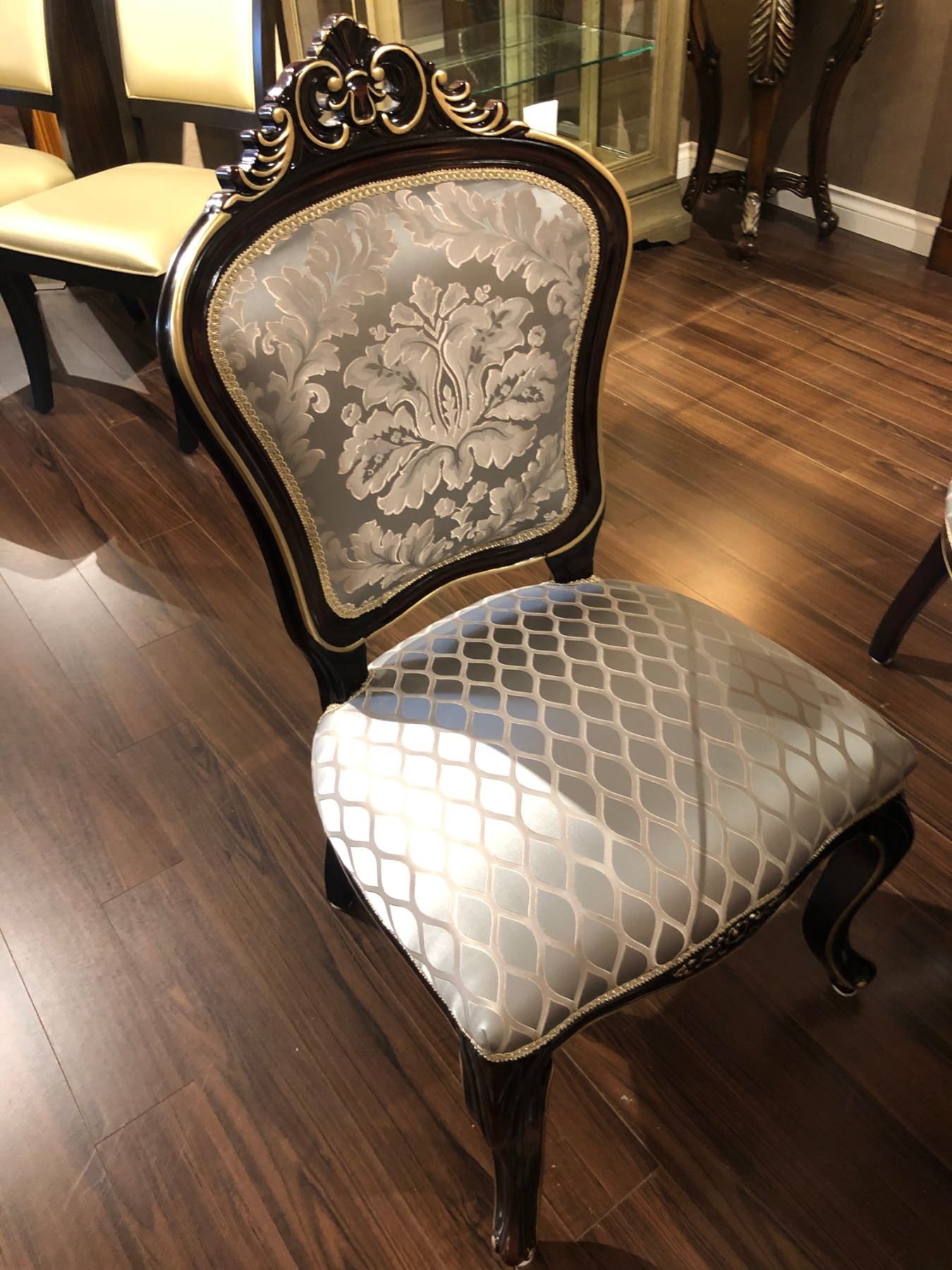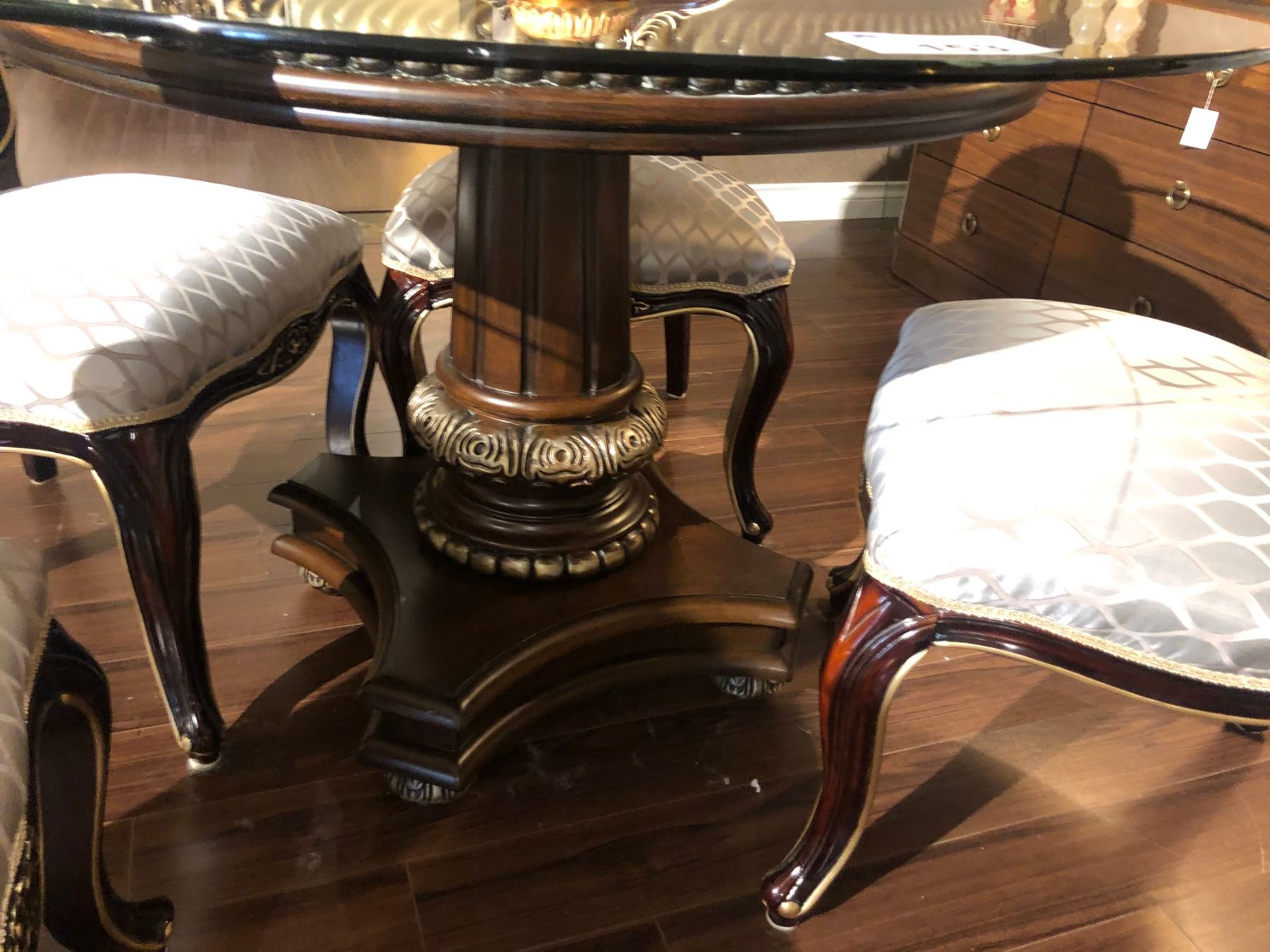 FORMAL DINING ROOM SET WITH ROUND GLASS TOP WITH CARVED BASE TABLE AND FOUR CHAIRS. RETAIL $6,000.00