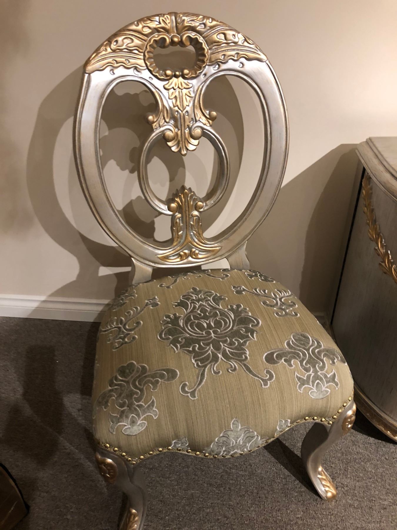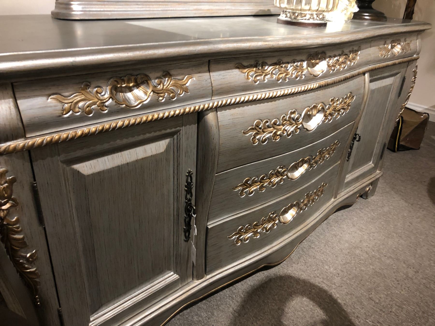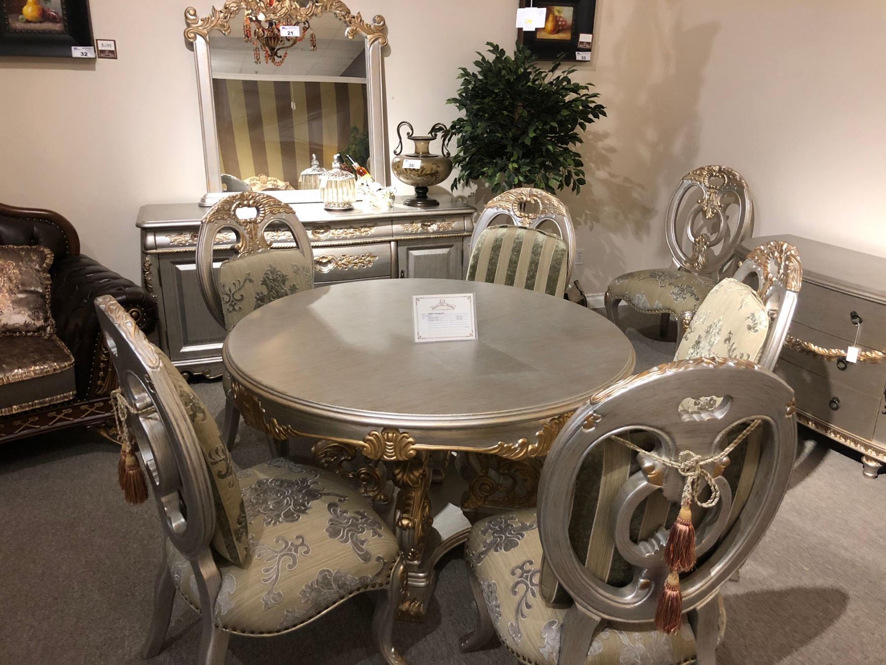 FORMAL DINING ROOM SET WITH ROUND TABLE, SIX CHAIRS AND MATCHING BUFFET WITH MIRROR RETAIL $17,000.00