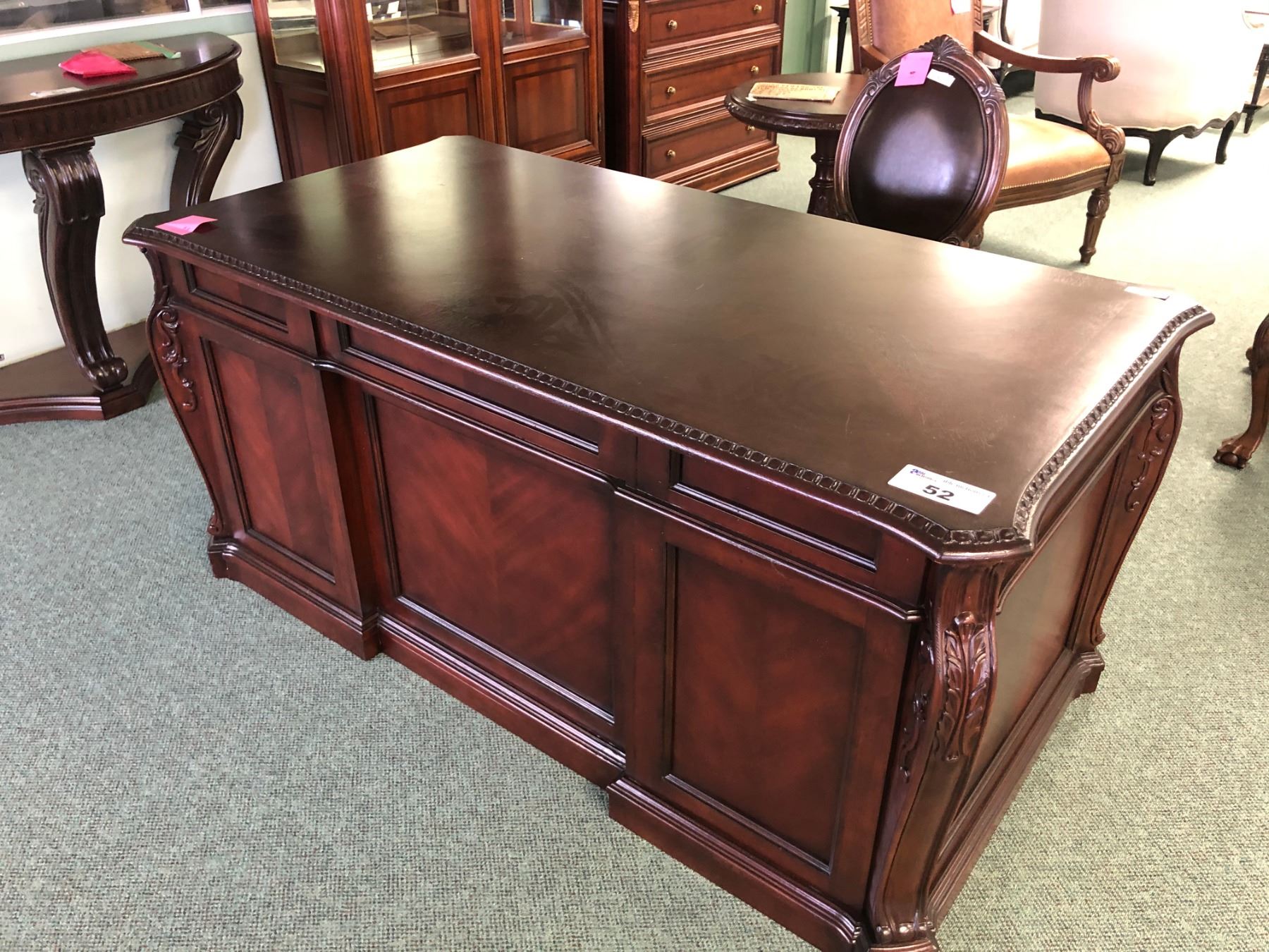 FORMAL HOME OFFICE DOUBLE PEDESTAL DESK WITH KEYBOARD TRAY AND CHAIR. APPROXIMATE RETAIL $5,100.00