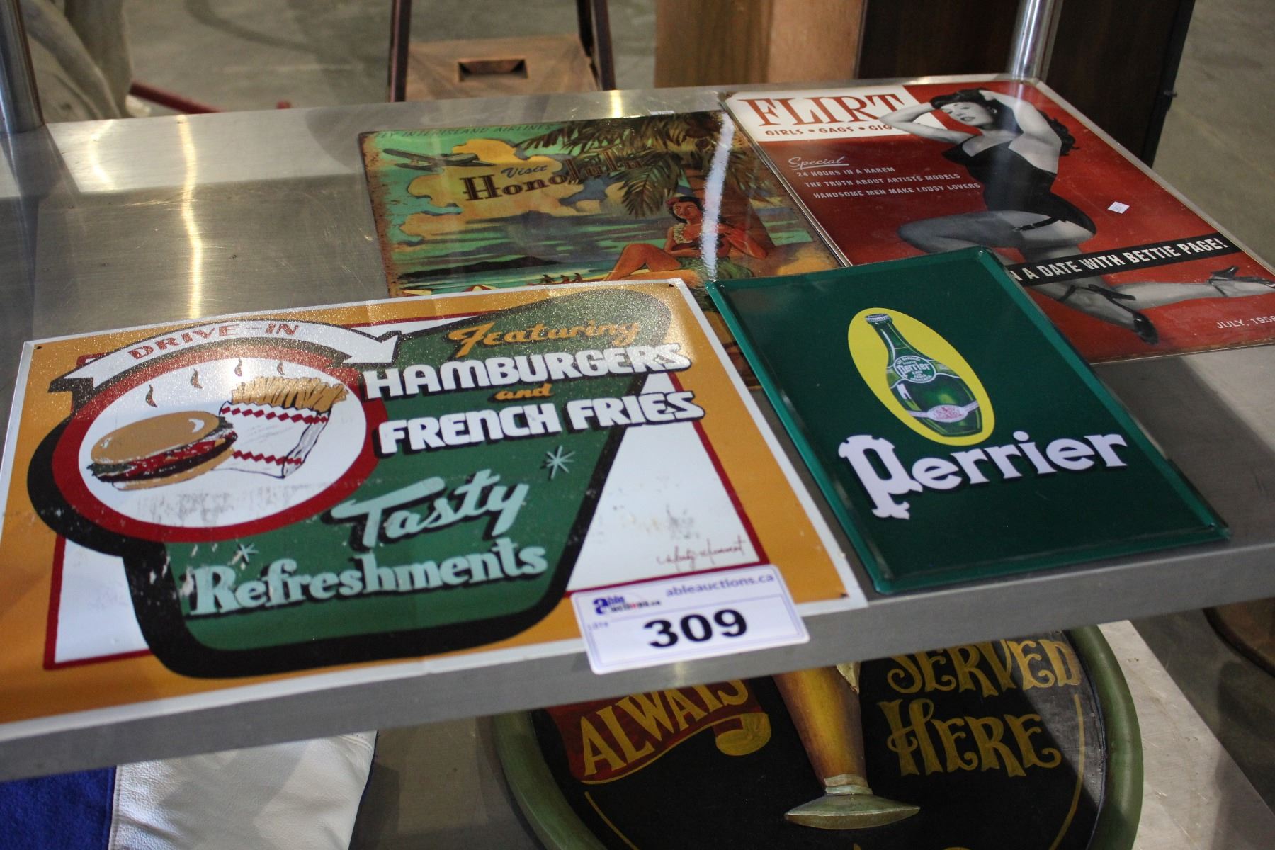 FOUR TIN SIGNS - "VISIT HONOLULU", "PERRIER", "FLIRT GIRLS - GAGS - GIGS-" & "DRIVE IN FEATURING HAMBURGERS AND FRENCH FRIES"