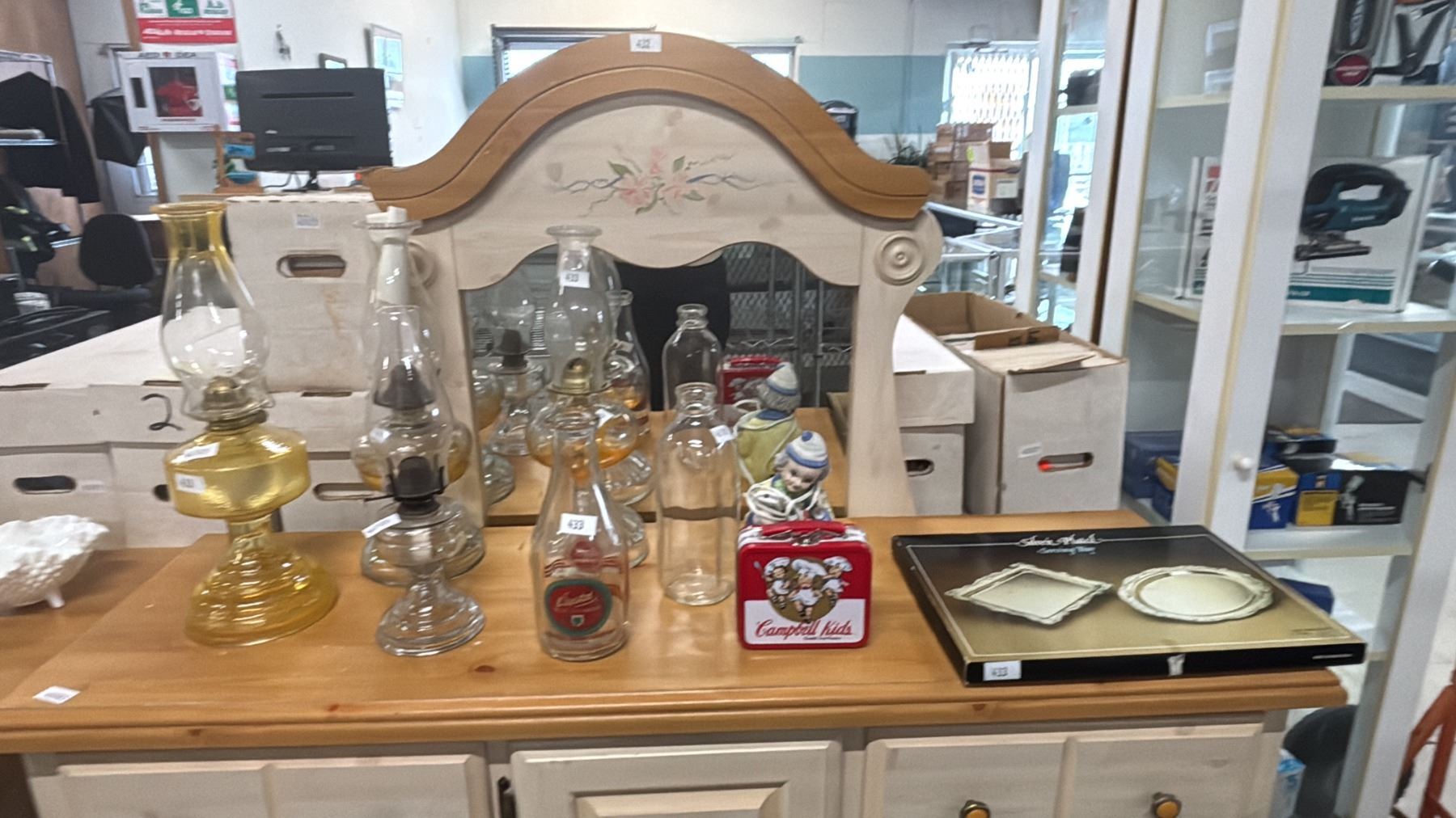 FOUR VINTAGE OIL LAMPS, TWO MILK BOTTLES, CAMPBELL KIDS LUNCHBOX, CLOWN LAMP & OVAL SERVING TRAY