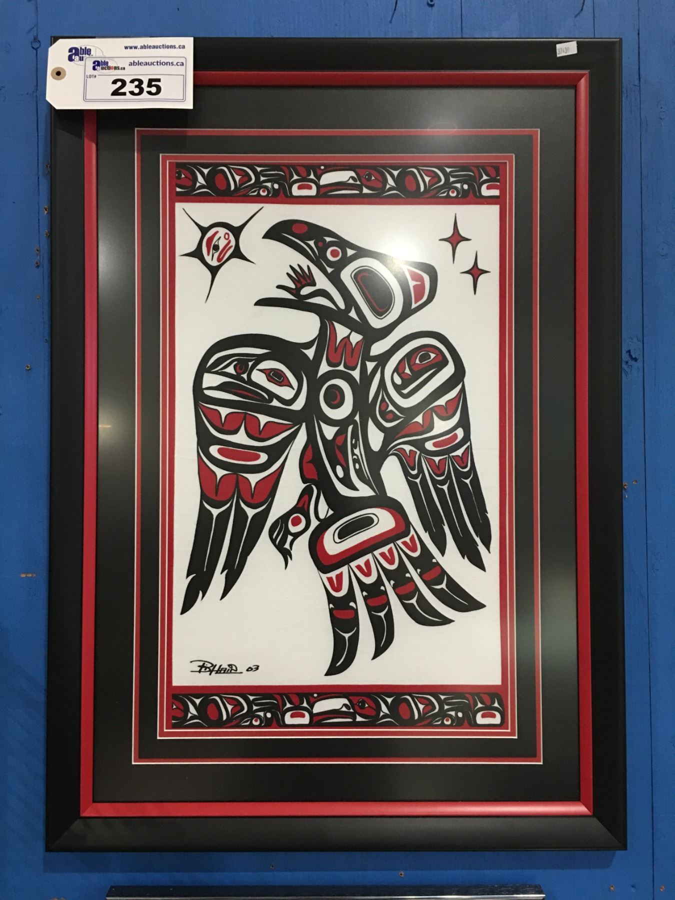 FRAMED BC FIRST NATIONS SILK SCREEN PAINTING SIGNED BOTTOM LEFT CORNER BY ARTIST - 22" X 31"