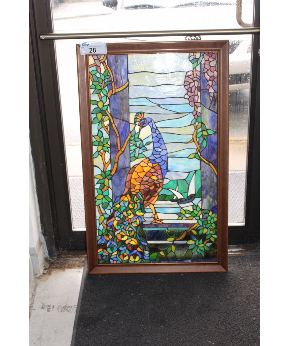 FRAMED LEADED STAINED GLASS DECORATIVE WINDOW PANEL - PEACOCK