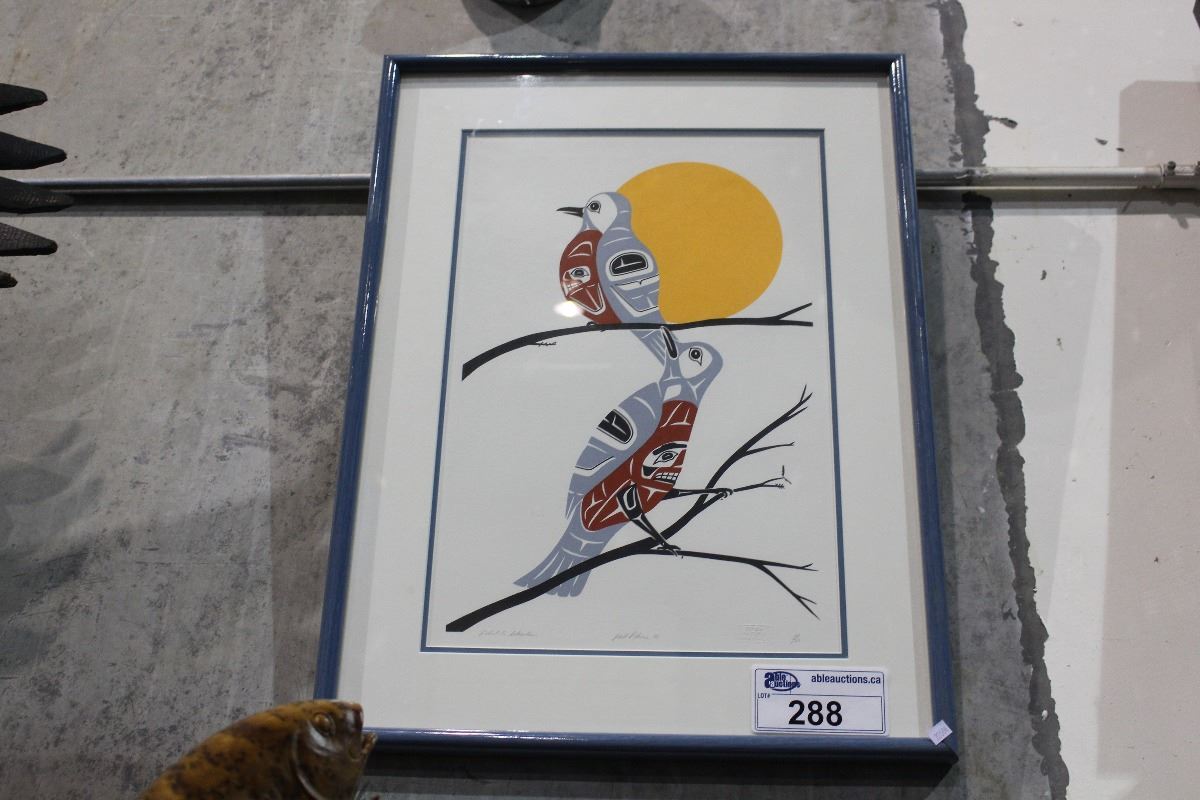 FRAMED LIMITED EDITION SIGNED AND NUMBERED WEST COAST NATIVE PRINT "FALL ROBINS" SIGNED BY ARTIST