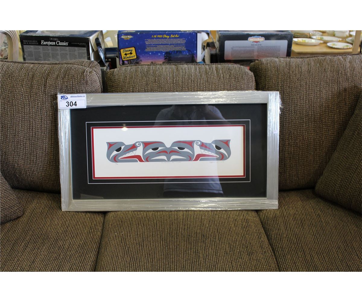 FRAMED LIMITED EDITION SIGNED AND NUMBERED WEST COAST NATIVE PRINT TITLED THUNDERBIRD AND WOLVES