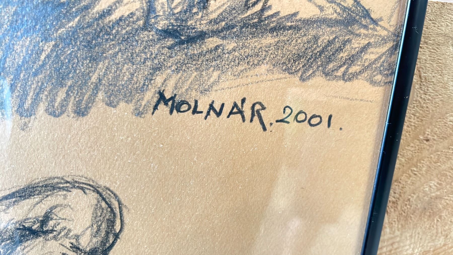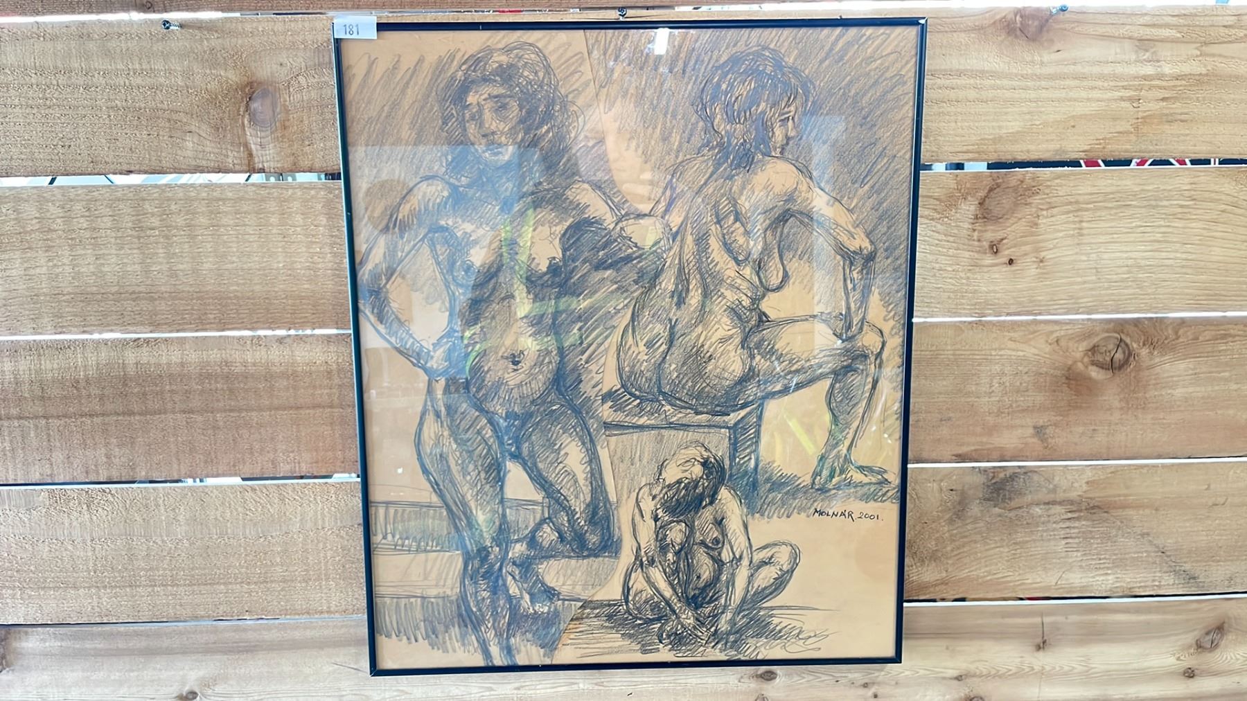 FRAMED NUDE CHARCOAL PENCIL SKETCH DRAWING ON PAPER BY FRANK MOLNAR OF "WOMAN IN 3 STAGES" 20" X 24"