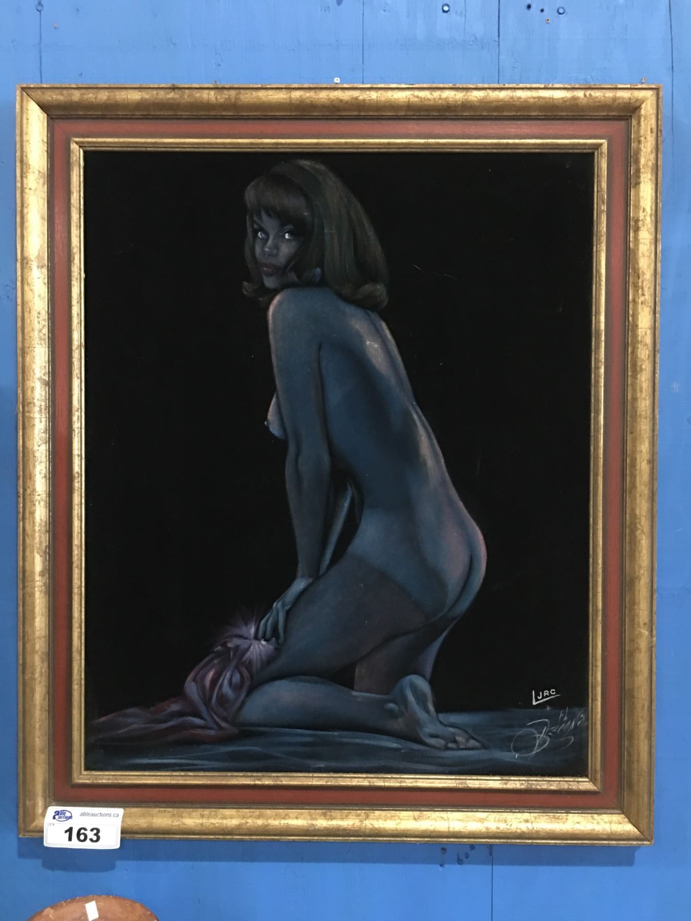 FRAMED "NUDE WOMAN" ON VELVET WALL HANGING - SIGNED BOTTOM RIGHT CORNER 32 1/2" X 39"