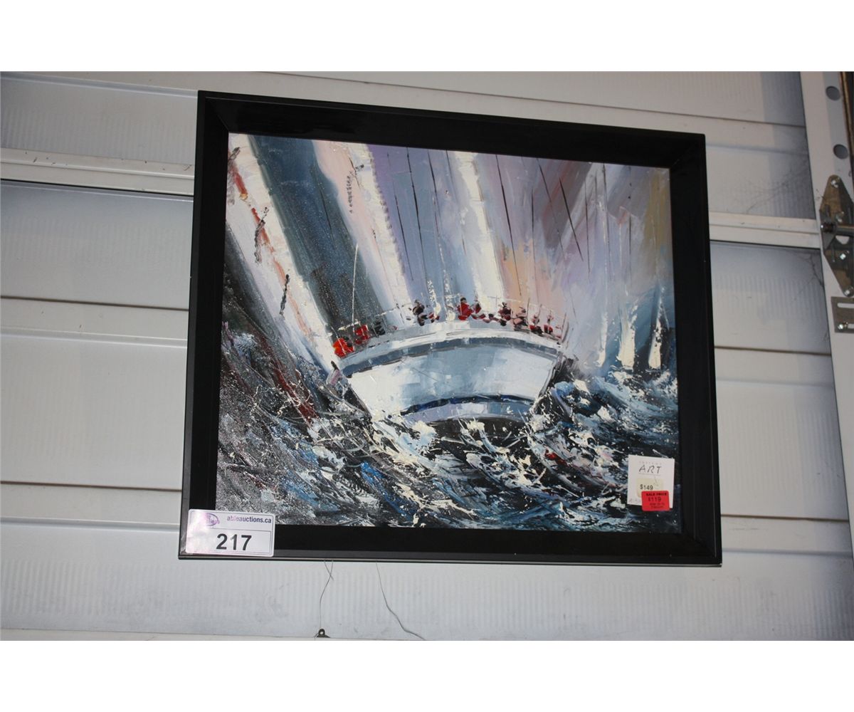 FRAMED OIL ON CANVAS BOAT IN STORM ARTWORK