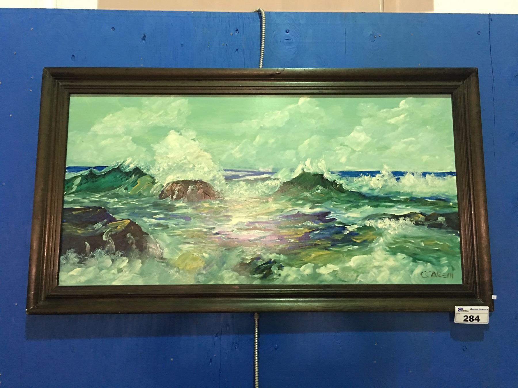 FRAMED ORIGINAL OIL ON BOARD SEASCAPE PAINTING SIGNED BOTTOM RIGHT CORNER ( FRAME MEASURES 54" X 30")