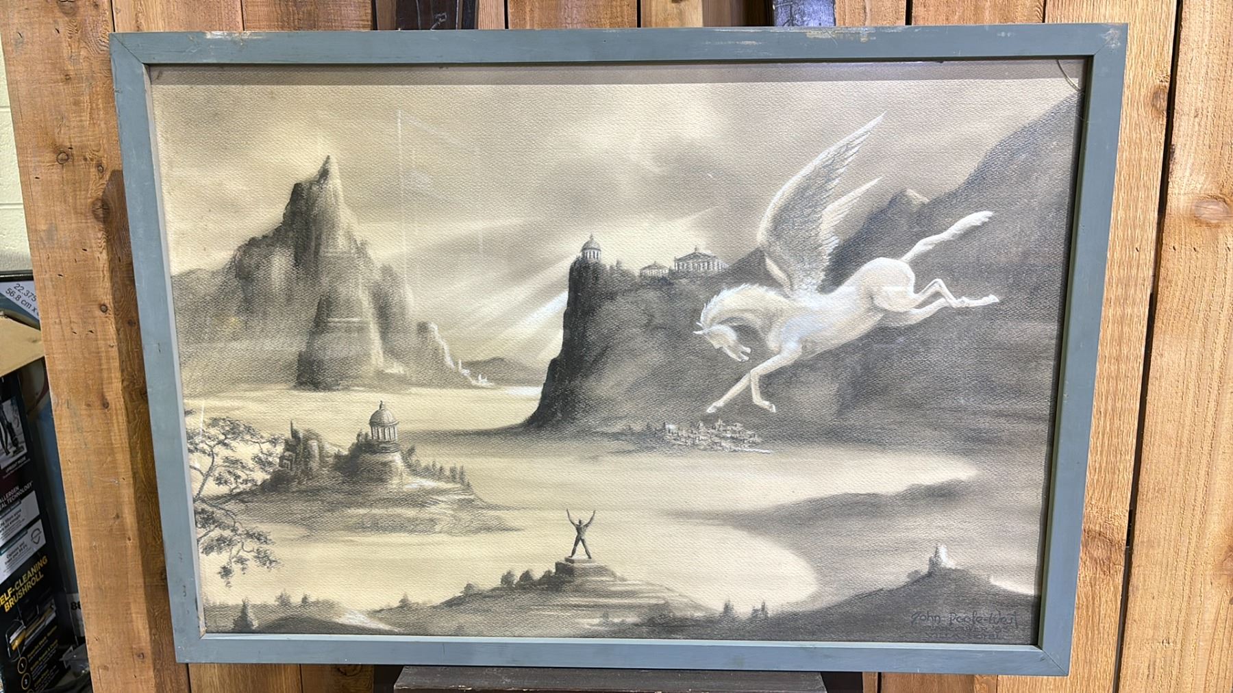 FRAMED ORIGINAL OIL ON CANVAS BY JOHN POOLE-WEST TITLED "PEGASUS COMES TO CORINTH" 38" X 26"