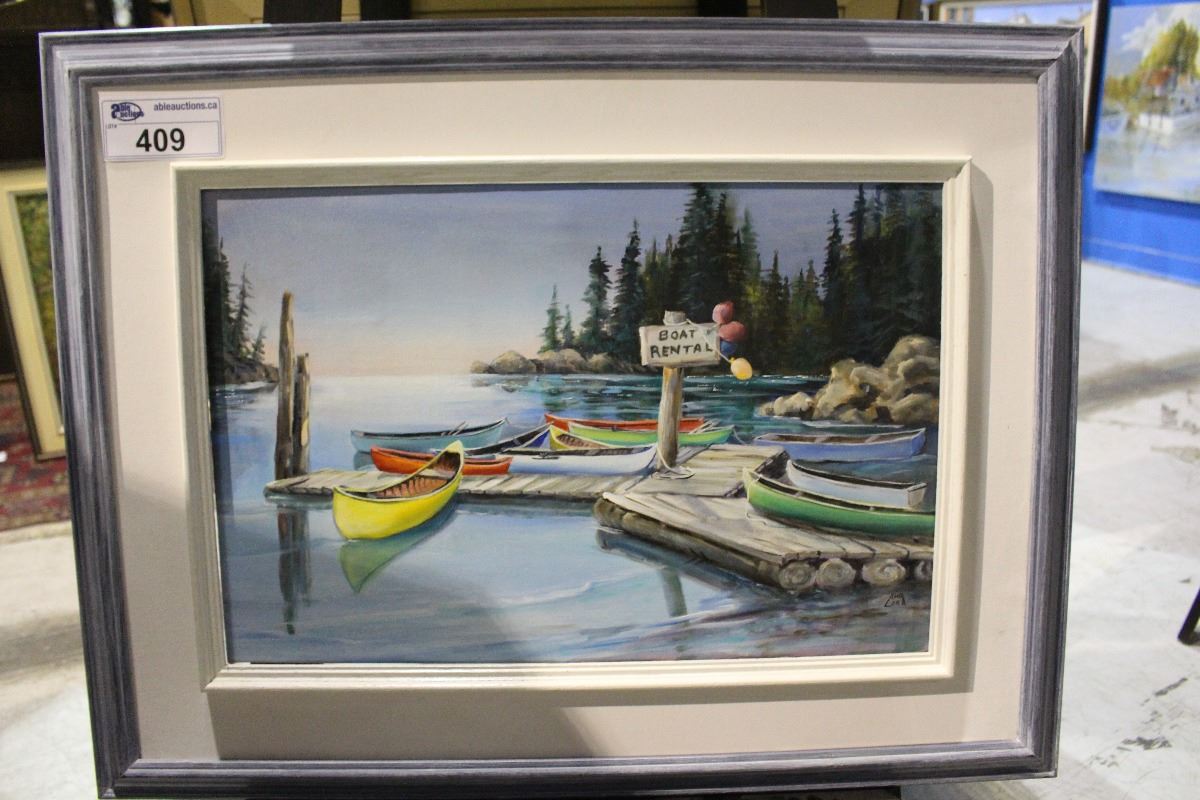 FRAMED ORIGINAL OIL ON CANVAS PAINTING "BOAT RENTAL" BY ARTIST LORA ARMBRUSTER