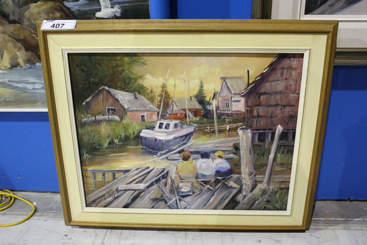 FRAMED ORIGINAL OIL ON CANVAS PAINTING "SITTING ON THE DOCK" BY ARTIST LORA ARMBRUSTER