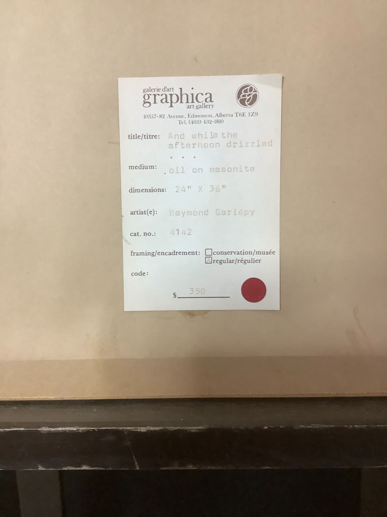 FRAMED ORIGINAL OIL ON MASONITE BY RAYMOND GARIEPY TITLED "AND WHILE THE AFTERNOON DRIZZLED" 24 X 36"