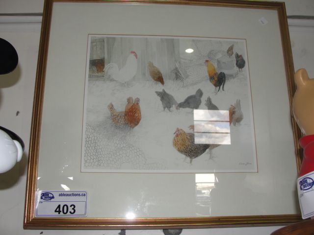 FRAMED ORIGINAL PENCIL ETCHING BY ARTIST OLIVER JONES TITLED "CHICKEN RUN"