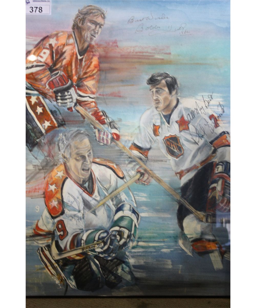 FRAMED PASTEL AUTOGRAPHED GORDIE HOWE PHIL ESPOZITO AND BOBBY OAR
