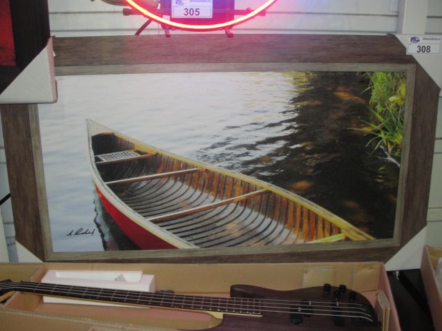 FRAMED PRINT ON BOARD "CANOE ON LAKE"
