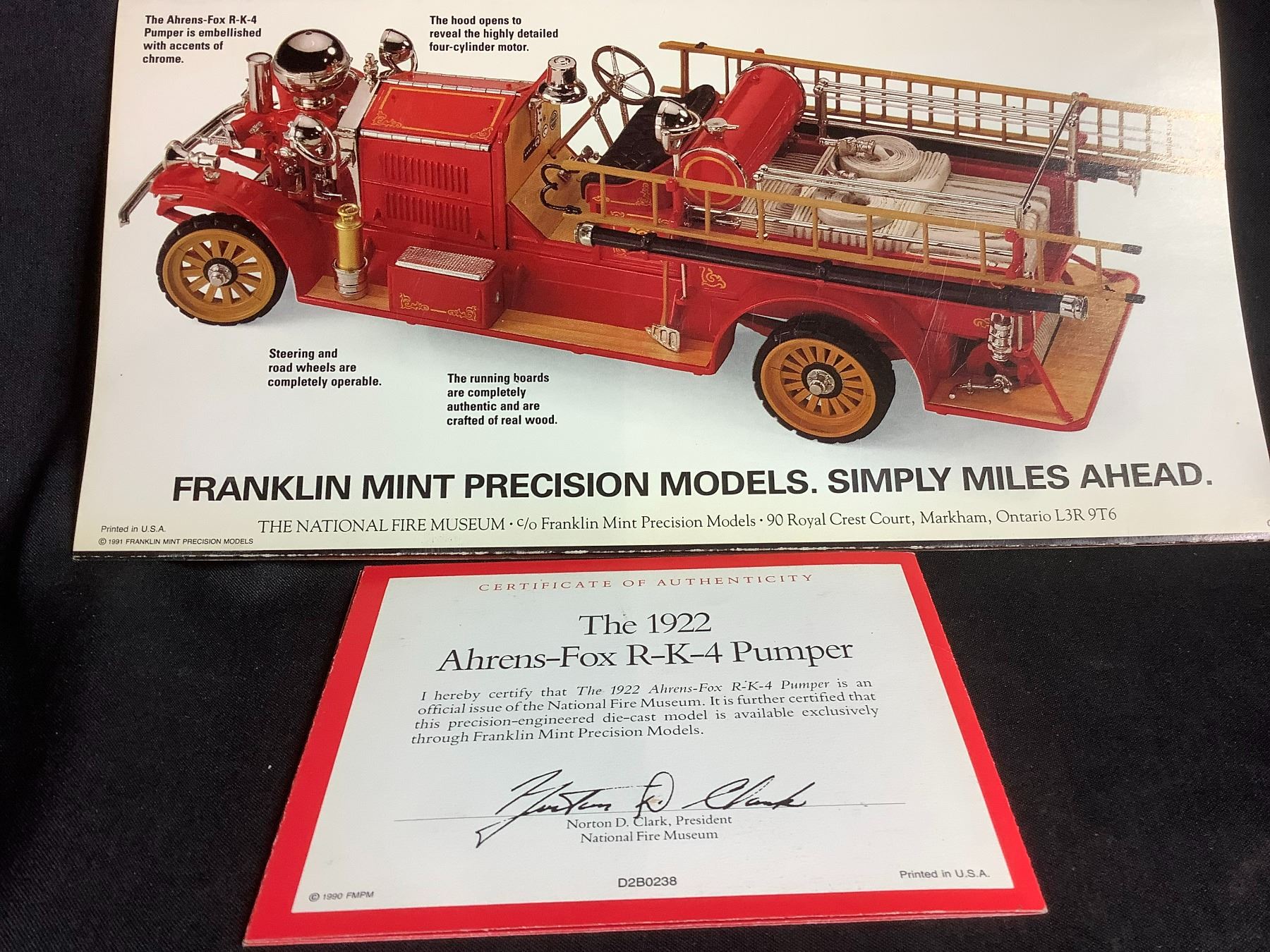 FRANKLIN MINT PRECISION MODELS THE 1922 AHRENS-FOX R-K-4 PUMPER 1:24 SCALE WITH COA