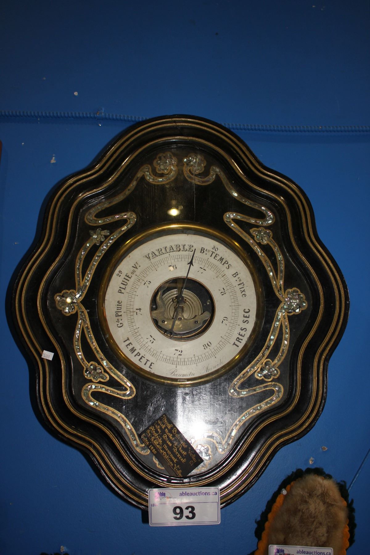 FRENCH VINTAGE BAROMETER, MOTHER OF PEARL INLAY WITH BRASS BEZEL. CIRCA 1880