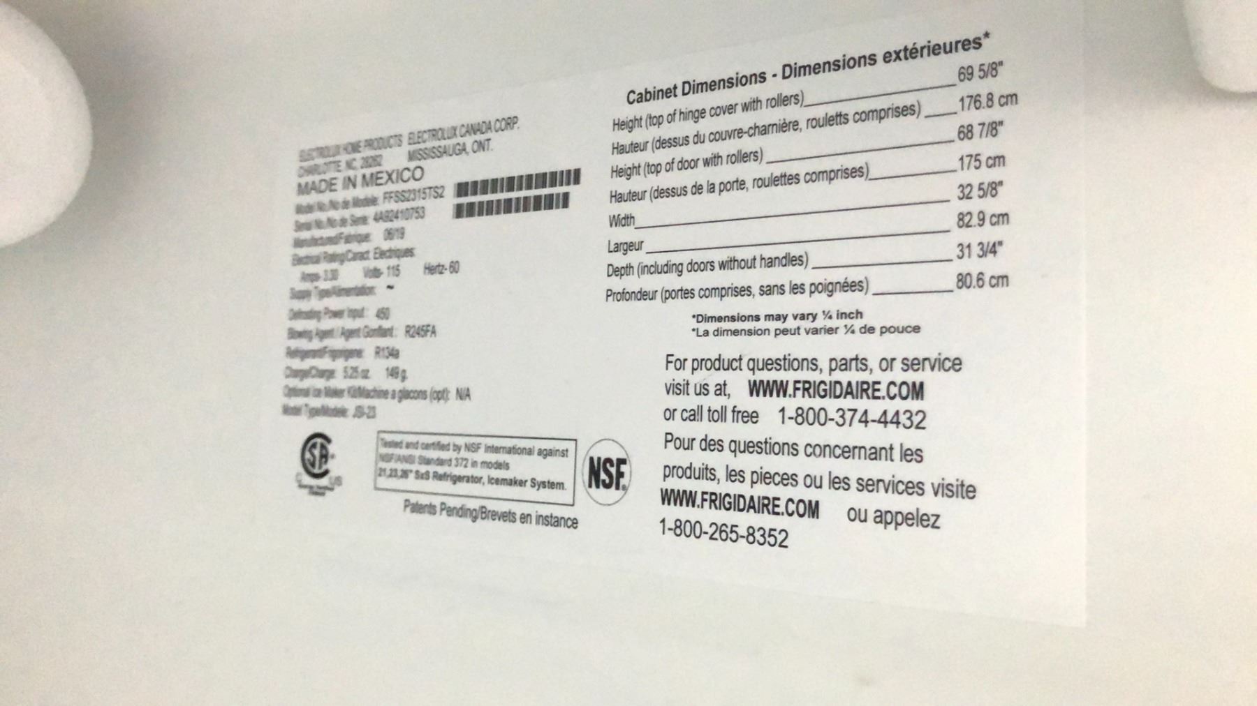FRIGIDAIRE JSI-23 SIDE-BY-SIDE 23 CUBIC FOOT REFRIGERATOR
