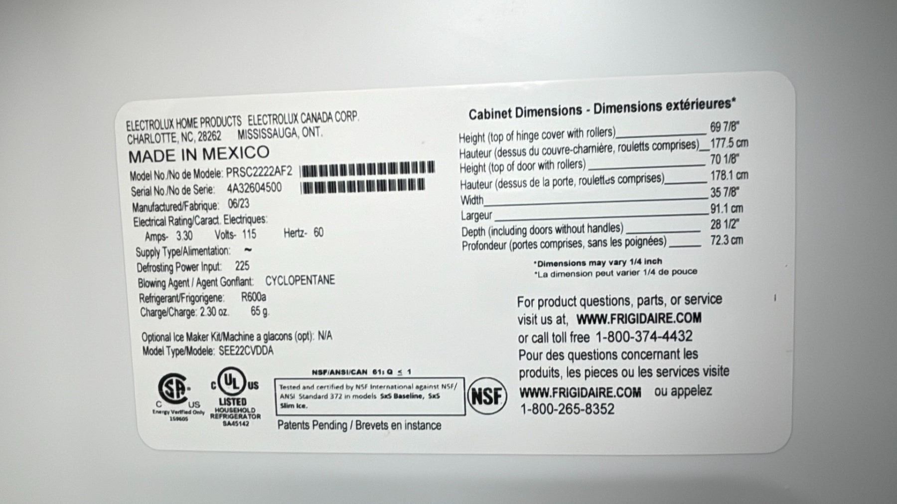 FRIGIDAIRE PROFESSIONAL STAINLESS STEEL SIDE BY SIDE FRIDGE WITH WATER/ICE DISPENSER